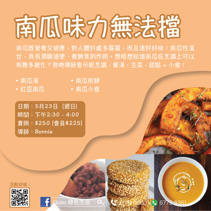 南瓜除了含有碳水化合物、蛋白質、鉀、鈣、鎂、磷, 還有豐富的維生素A、E、C、β-胡蘿蔔素、菸鹼酸、葉酸等營養。南瓜性溫甘,具有潤腸通便、養脾胃的作用。想唔想知道南瓜在烹調上可以有幾多變化?我哋導師會示範烹調 – 餐湯,主菜,甜點 + 小食!