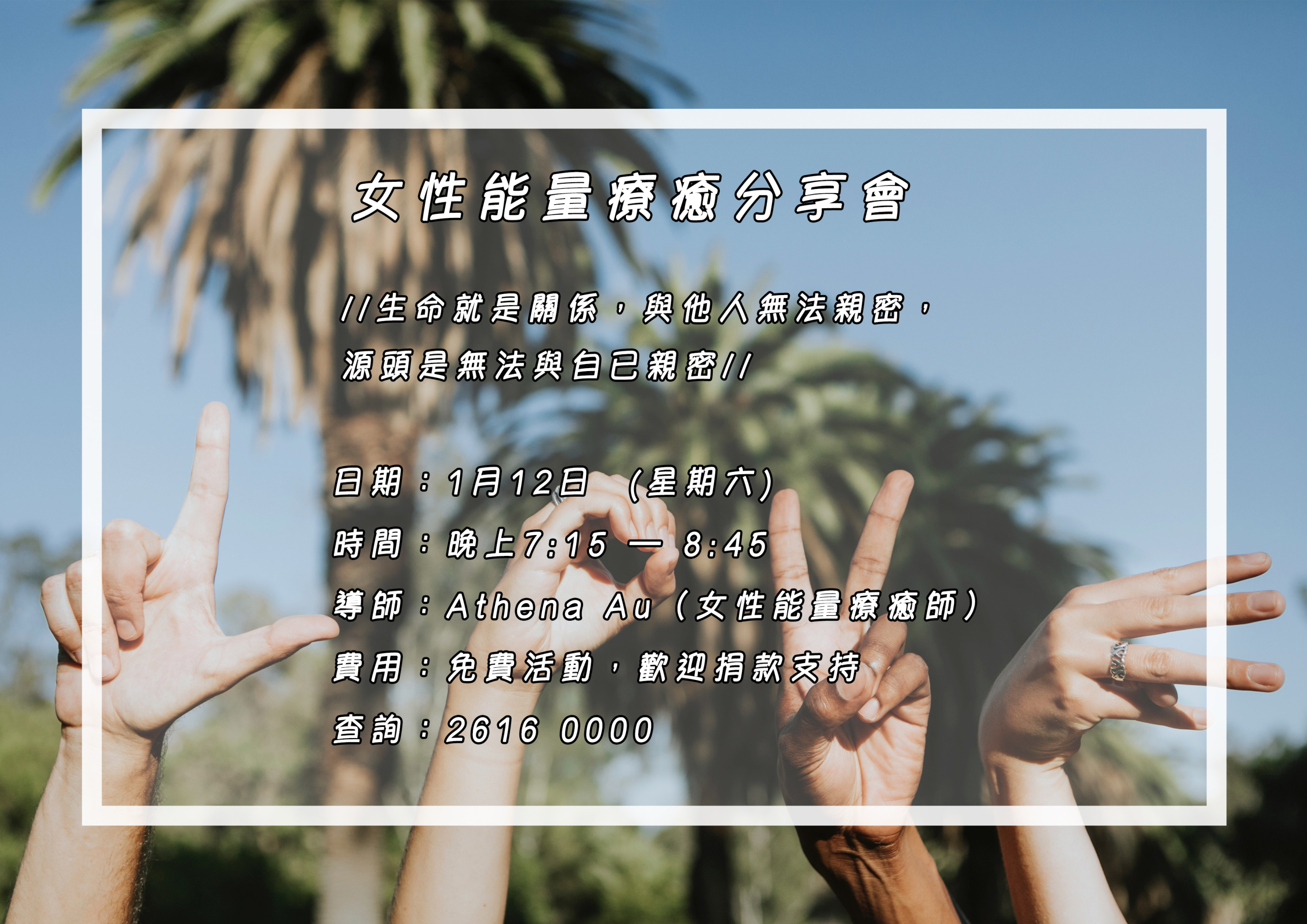 在分享會中, Athena會帶引参加者體驗與身,💗連結的奇妙及喜悦。覺察被忽略的內在狀態和傷痛,並嘗試以女性能量自我療癒。學習珍愛自已,藉此啟動 [自愛力]。