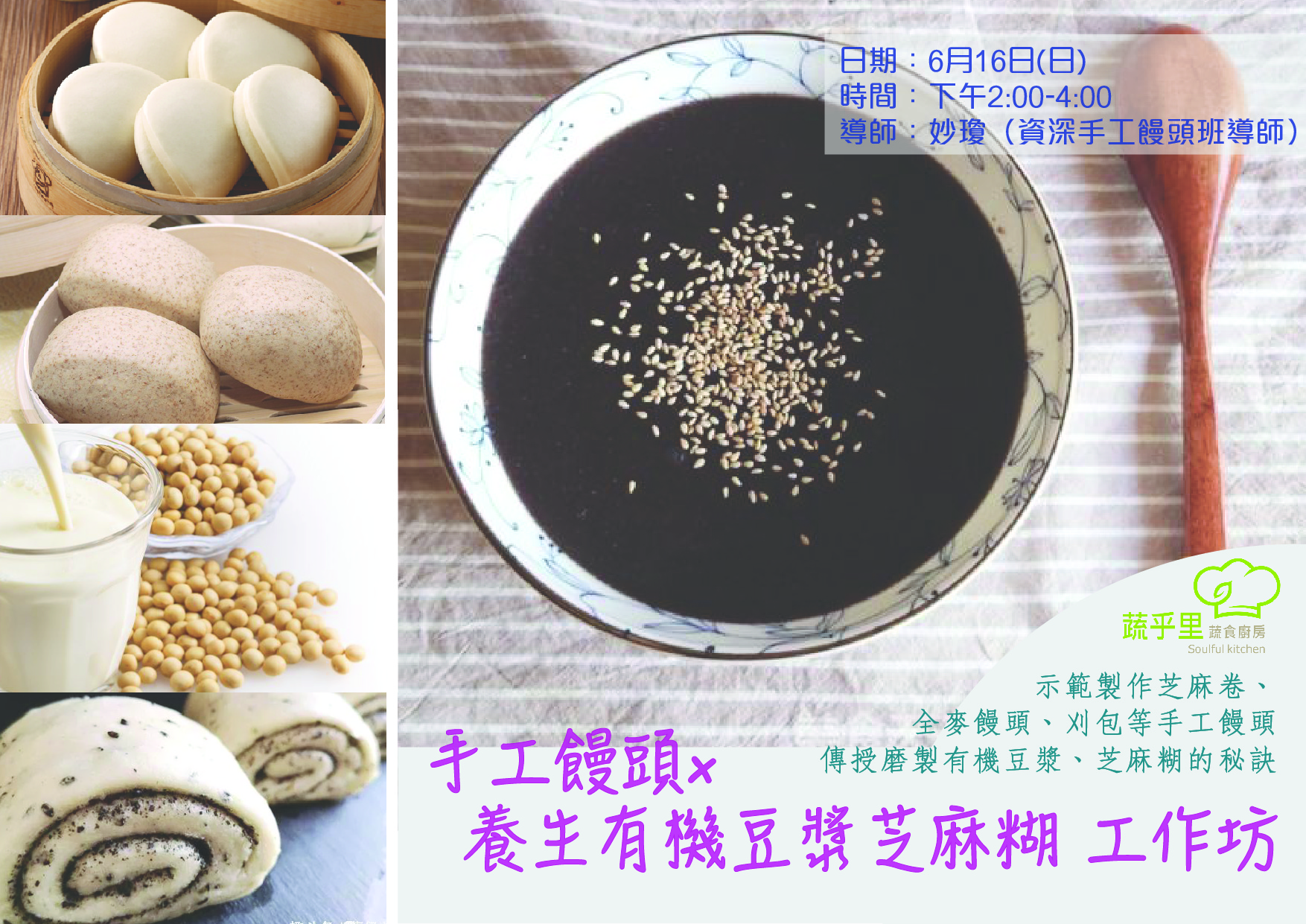 6月16日下午,資深手工饅頭班導師妙瓊會示範製作芝麻卷、全麥饅頭、刈包等手工饅頭,全部手工製作;另會傳授磨製有機豆漿、芝麻糊的秘訣