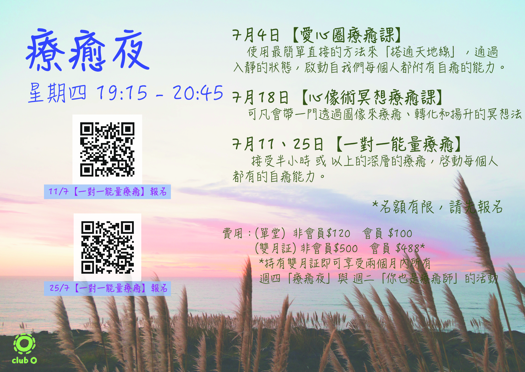 日期:逢星期四 時間:晚上 7:15 – 8:45 導師:Club O療癒師團 內容: 11月7日:愛心圈大休息(自由定價) 11月14日:心像術冥想 (導師:周可凡) 11月21日:心靈頌唱 (導師:Winston Lau劉俊賢) 11月28日:一對一能量療癒課 費用:(單堂) 非會員 $120 會員 $100 (月證) 非會員 $300 會員