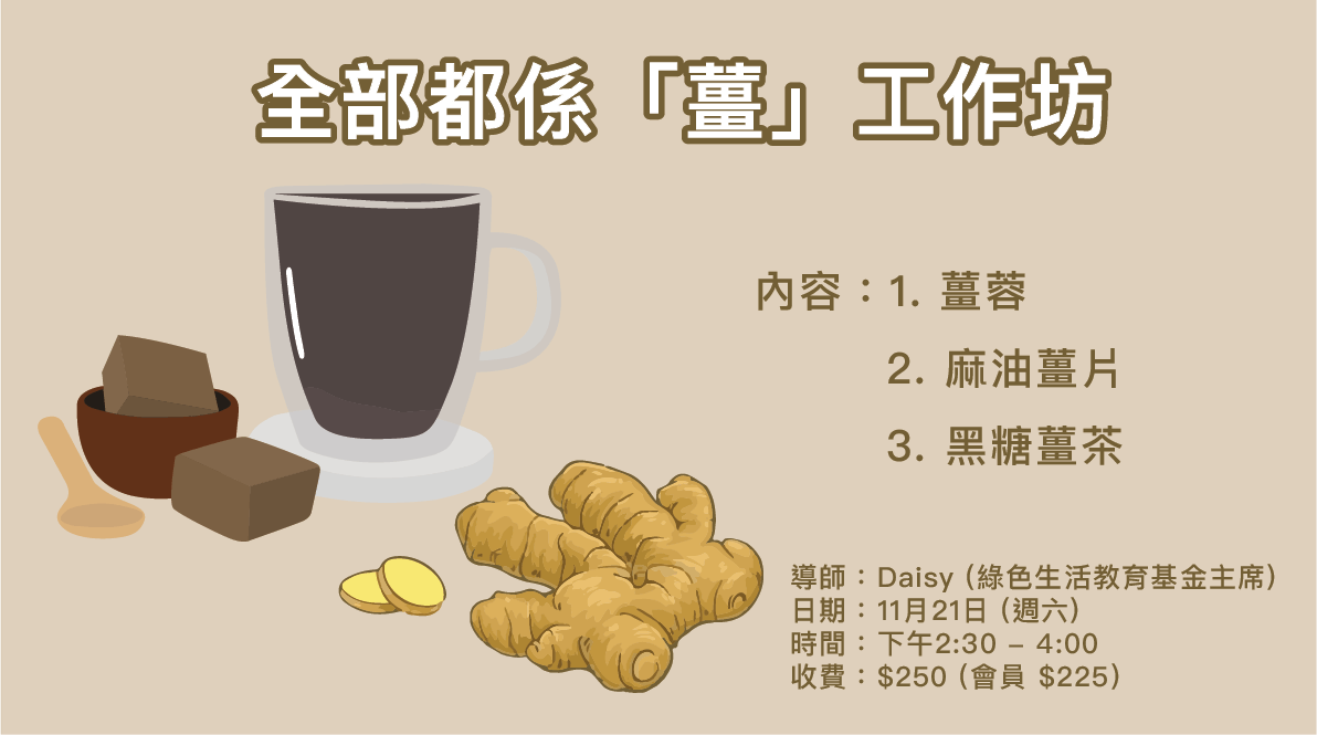 Club O 旺角亞皆老街86號昌明大厦7字樓FGH室全部都係【薑】工作坊 冬天一到,虛寒體質的朋友特別容易手凍腳凍。吃吃薑製品,可以促進血液循環,抗炎殺菌~今次廚藝達人Daisy會教整幾款薑製品,歡迎來參加呀 內容:1. 薑蓉 麻油薑片 黑糖薑茶 Daisy(綠色生活教育基金主席|廚藝達人) 日期:11月21日 (週六) 時間:下午2:30-4:00 地點:GH室 費用:非會員$250 會員$225 各位參加者需預先留座,不設Walk-in,如若成功Club O 會容後透過 WhatsApp 通知您。 –網上報名表:https://forms.gle/WLMuhqjZtKuE2uMv6 —————————————- 馬上申請成為Club