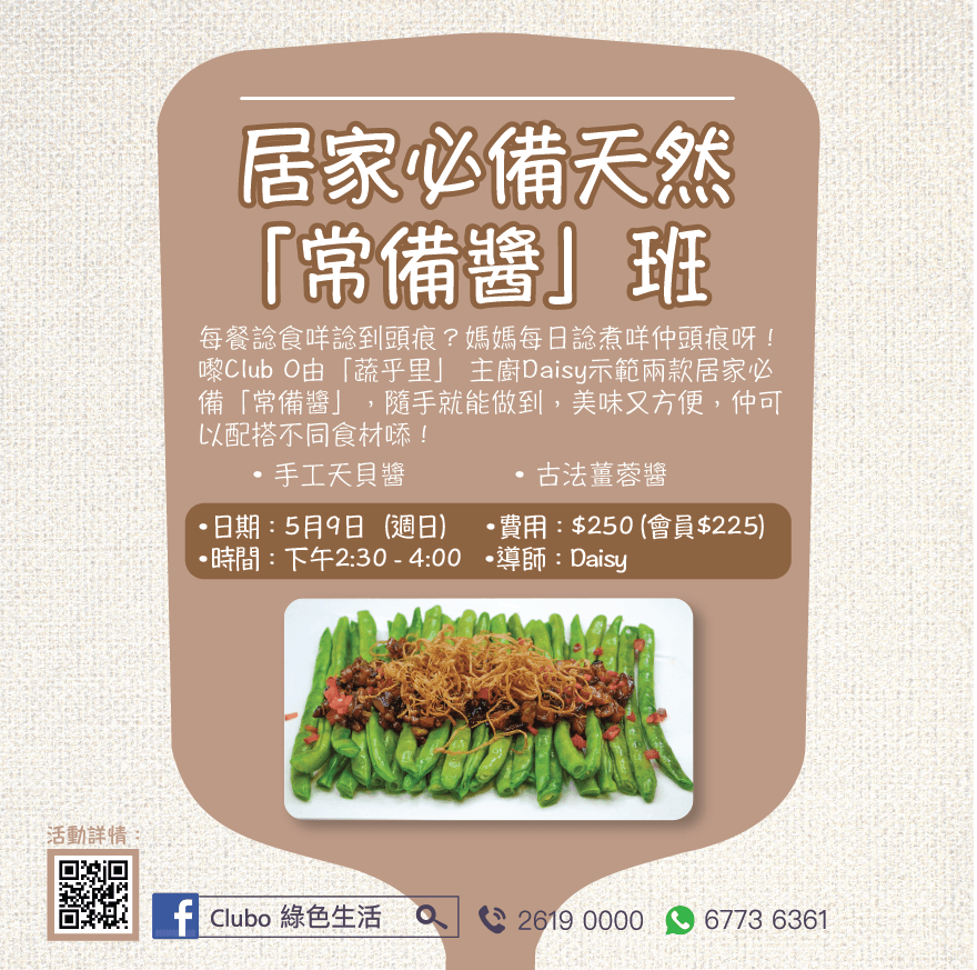 Club O 旺角亞皆老街86號昌明大厦7字樓FGH室《居家必備天然「常備醬」》 導師:Daisy 日期:5月9日 (週日) 時間:下午2:30 - 4:00 費用:$250(會員$225) 每餐諗食咩諗到頭痕?每日諗煮咩仲頭痕呀!黎Club O由「蔬乎里」 主廚Daisy分享示範兩款居家必備「常備醬」,簡簡單單隨手就能做到美味又方便嘅「常備醬」喇! • 手工天貝醬 • 古法薑蓉醬 ------------------------------------------------------------------- 報名表:https://forms.gle/GqYruiWx7XZYDqD19 ------------------------------------------------------------------- 馬上申請成為Club O會員, 享有會員優惠: https://forms.gle/p5tfx2Cjir9Uy5EU8 * *