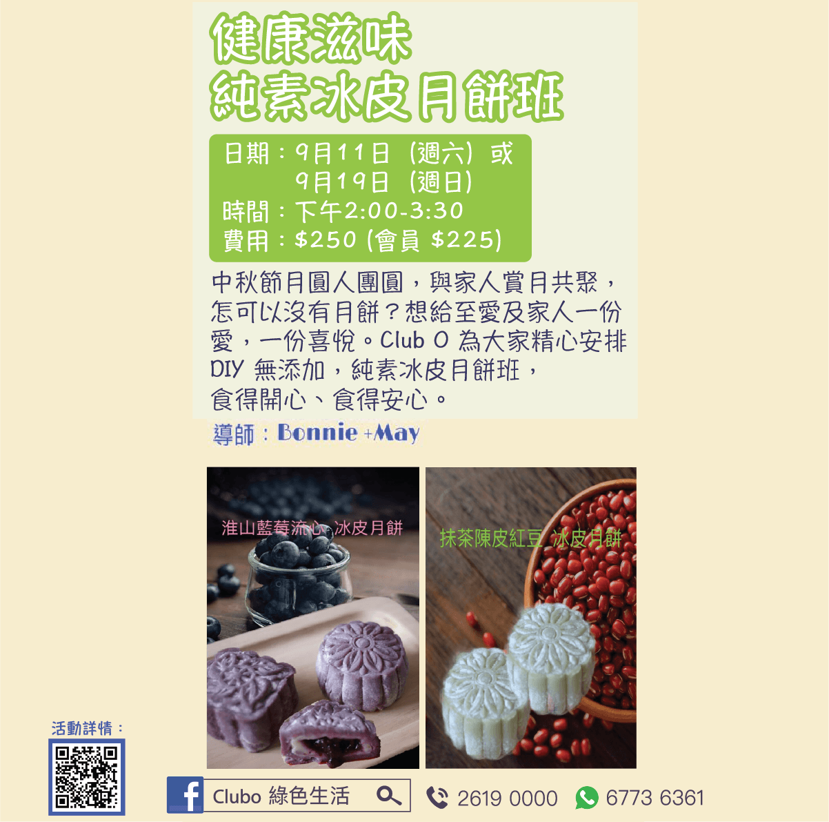 Club O 旺角亞皆老街86號昌明大厦7字樓FGH室《健康滋味 純素冰皮月餅班》 日期:2021年9月11日(六)、19日(日) 時間:下午2:00-3:30 費用:$250 (會員 $225) 導師:Bonnie + May 中秋節月圓人團圓,與家人賞月共聚,怎可以沒有月餅 想給至愛及家人 一份愛,一份喜悅. Club O 為大家精心安排 DIY 無添加,純素冰皮月餅班 食得開心 食得安心 親朋戚友喜愛的-陳皮紅豆 小朋友鐘意的-藍莓流心 ——————————————————————- 報名表:https://forms.gle/bjLkAjjvnfC3pY44A