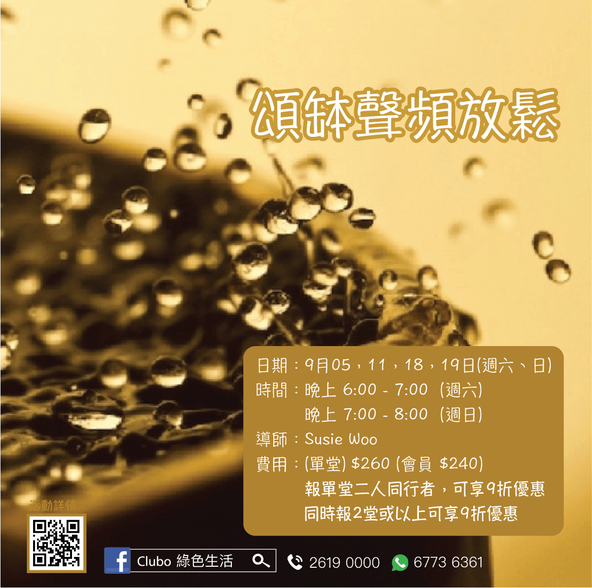 Club O 旺角亞皆老街86號昌明大厦7字樓FGH室以敞開、喜悦、輕鬆自在的狀態,享受頌缽聲,「萬事萬物都是能量的振動」 就讓泛音振動蔓延全身,給自己和細胞深度休息,啟動我們自癒的能力。通過與自己連結的狀態,靜觀自己的念頭。靜觀,等待...體驗回到當下。 #頌缽 #療癒 #singingbowls #sound healing 對象:有興趣與身心連結的朋友們參加,無需經驗。 導師:Susie Woo 日期及時間:2021年9月05 (日) 晚上7:00-8:00 9月11 (六) 晚上6:00-7:00 9月18 (六) 晚上6:00-7:00 9月19 (日) 晚上7:00-8:00 費用:每堂每位 $260(會員