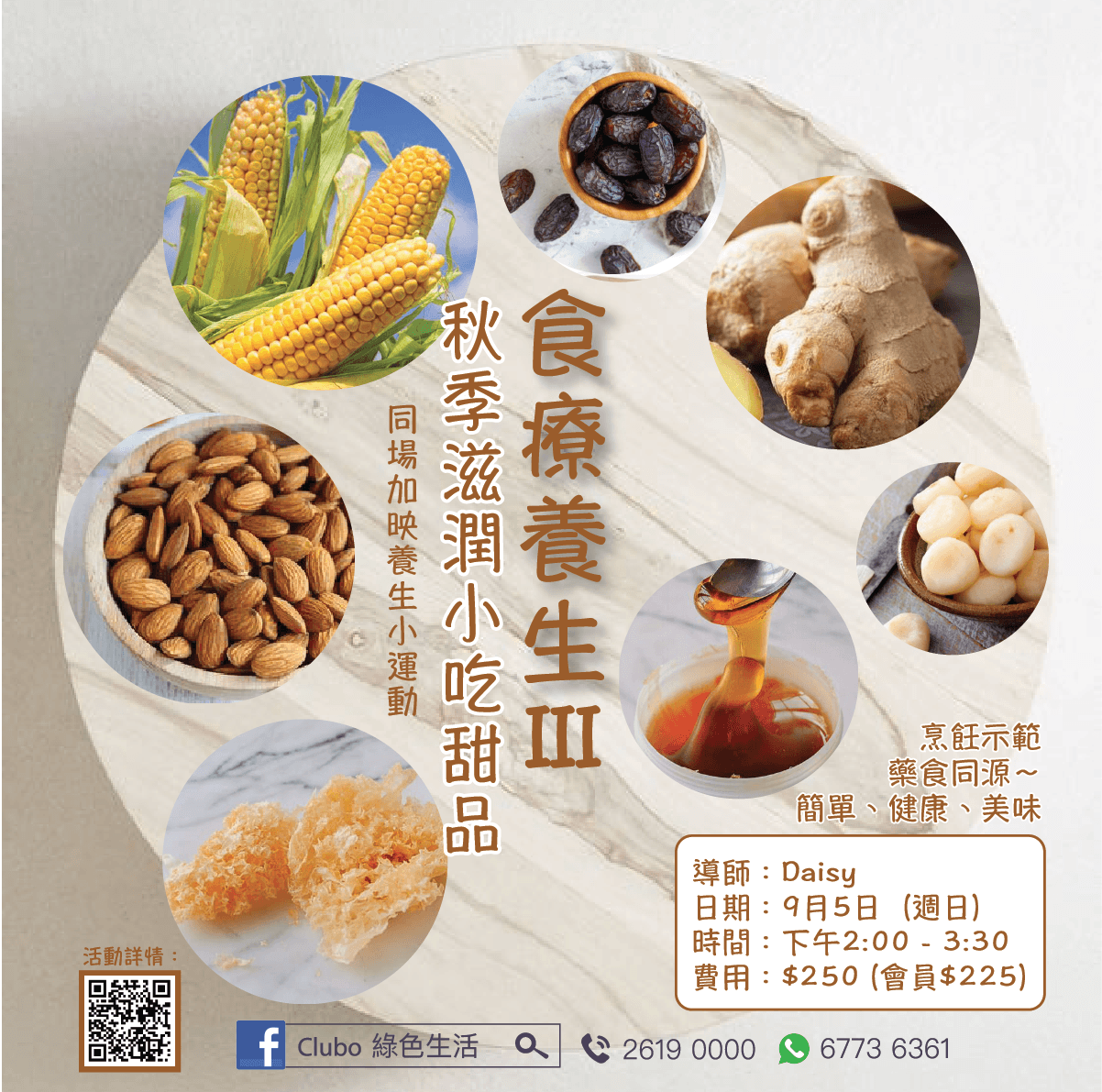 Club O 旺角亞皆老街86號昌明大厦7字樓FGH室《食療養生III - 秋季滋潤篇》 日期:2021年9月5日(日) 時間:下午2:00-3:30 費用:$250 (會員 $225) 導師:Daisy Daisy喜歡用簡單易做的烹調方法煮出美味又健康的食物,這次她會運用幾款不同的食材如:雪耳,杏仁,薑、馬蹄,椰棗,蜜芽糖等製造出各式各樣的小吃和甜品。為身體提供不同的營養和滋潤,達至藥食同源的理念。同場加映,Daisy還會將自己 -養生的小運動和大家分享,使您裏裏外外都滋潤無比。 ——————————————————————- 報名表:https://forms.gle/bjLkAjjvnfC3pY44A ——————————————————————- 馬上申請成為Club O會員, 享有會員優惠: https://forms.gle/p5tfx2Cjir9Uy5EU8 * * * * * *