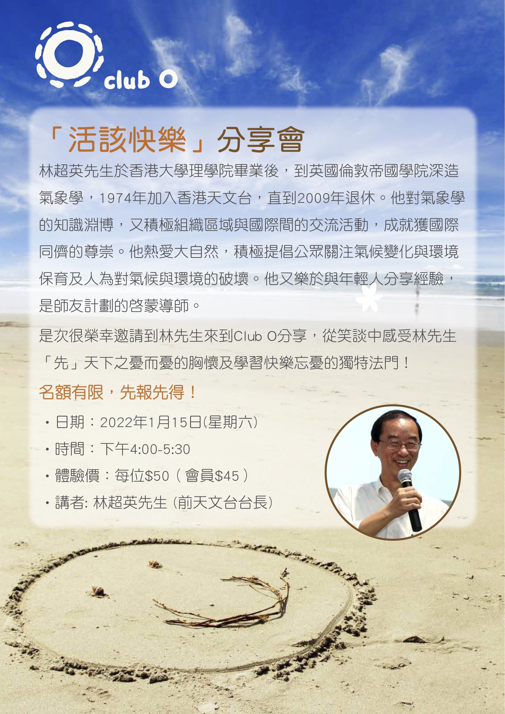 Club O 旺角亞皆老街86號昌明大厦7字樓FGH室認識林超英先生的人大都知道他為世上不少問題擔憂,但又覺得他很開心幽默,好奇他在甚麼地方找到開心的能量,講座中林先生會談自小到大的學習旅程,以觀星為起點,沿途不斷遇上新興趣、新事物,目不暇給,在不斷的發現中得到啟發和能量,近年低頭觀花,走進無限世界,更是喜極忘憂。很難得邀請到林超英先生來Club O,萬勿錯過如淋春風的分享,在笑談中感受林生[先]天下之憂而憂的胸懷及學習快樂忘憂的法門,座位有限,報名請早。