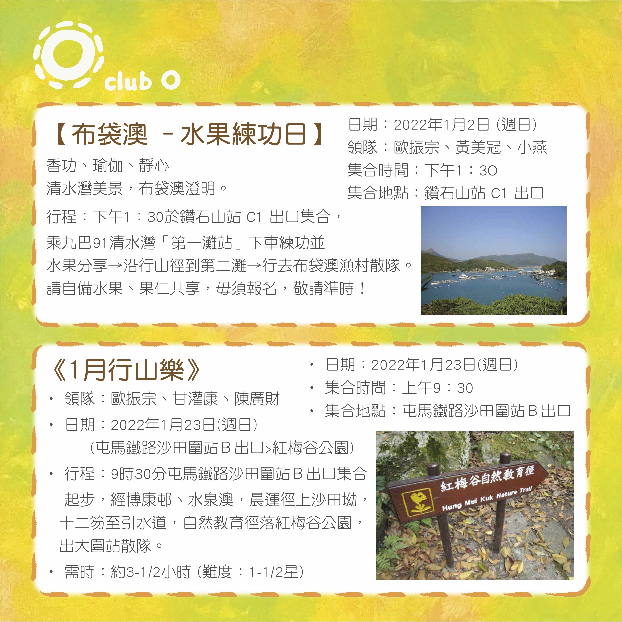 《1月行山樂》 日期:2022年1月23日(週日) (屯馬鐵路沙田圍站B出口>紅梅谷公園) 行程:9時30分屯馬鐵路沙田圍站B出口集合起步,經博康邨、水泉澳,晨運徑上沙田坳,十二笏至引水道,自然教育徑落紅梅谷公園,出大圍站散隊。 集合時間:上午9:30 集合地點:屯馬鐵路沙田圍站B出口 需時:約3-1/2小時 (難度:1-1/2星) 領隊:歐振宗、甘灌康、陳廣財 於集合時間在集合地點等候,敬請準時! (註:黃雨取消,微雨照常)