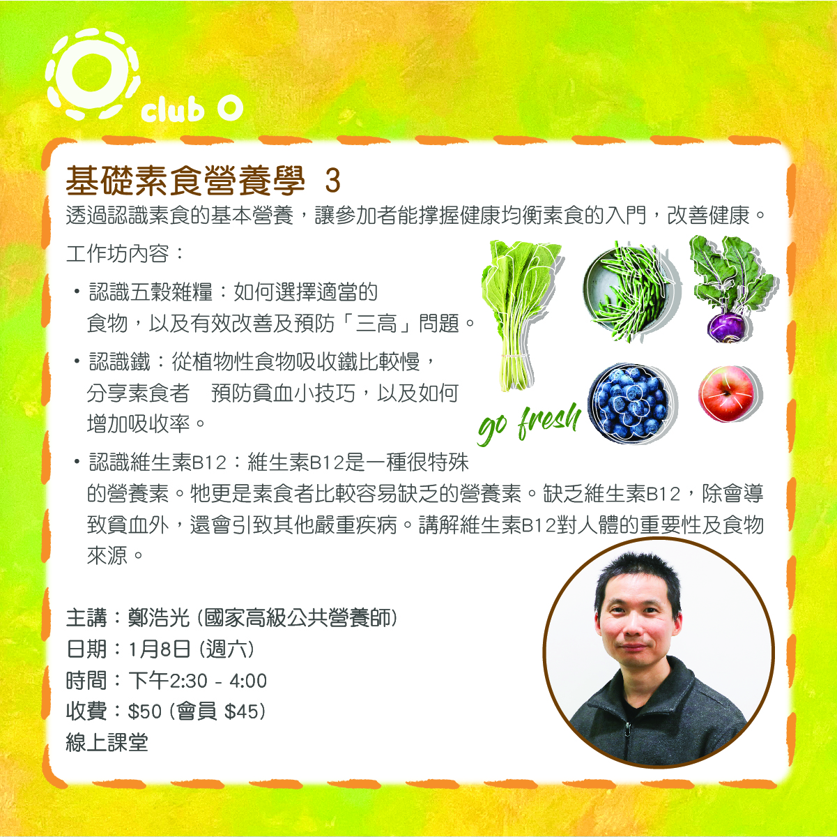 線上(綠色生活APP)透過認識素食的基本營養,讓參加者能撑握健康均衡素食的入門,改善健康。 今次內容: 認識五穀雜糧:即使飲食清淡,滴油不沾,也可能導致血脂偏高及血糖不穩。 與大家探討個中原因,如何選擇適當的食物,以及有效改善及預防「三高」( 高血壓、高血糖、高血脂) 問題。 認識鐵:鐵是十分重要的營養素。從植物性食物吸收鐵比較慢,所以素食者需 特別注有足夠的補充。分享這些營養素的重要性、食物來源、素食者預防貧血 小技巧,以及如何增加吸收率。 認識維生素B12:維生素B12是一種很特殊的營養素。牠屬於水溶性維生素,但 擁有一些完全不同的屬性。維生素B12更是素食者比較容易缺乏的營養素,所 以是最被關注及最具爭議性的維生素。缺乏維生素B12,除會導致貧血外,還 會引致其他嚴重疾病,故建議素食者需特別留意。講解維生素B12對人體的重 要性及食物來源。 主講:鄭浩光 (國家高級公共營養師) 日期:1月8日 (週六) 時間:下午2:30 - 4:00 線上課堂 收費:$50 (會員