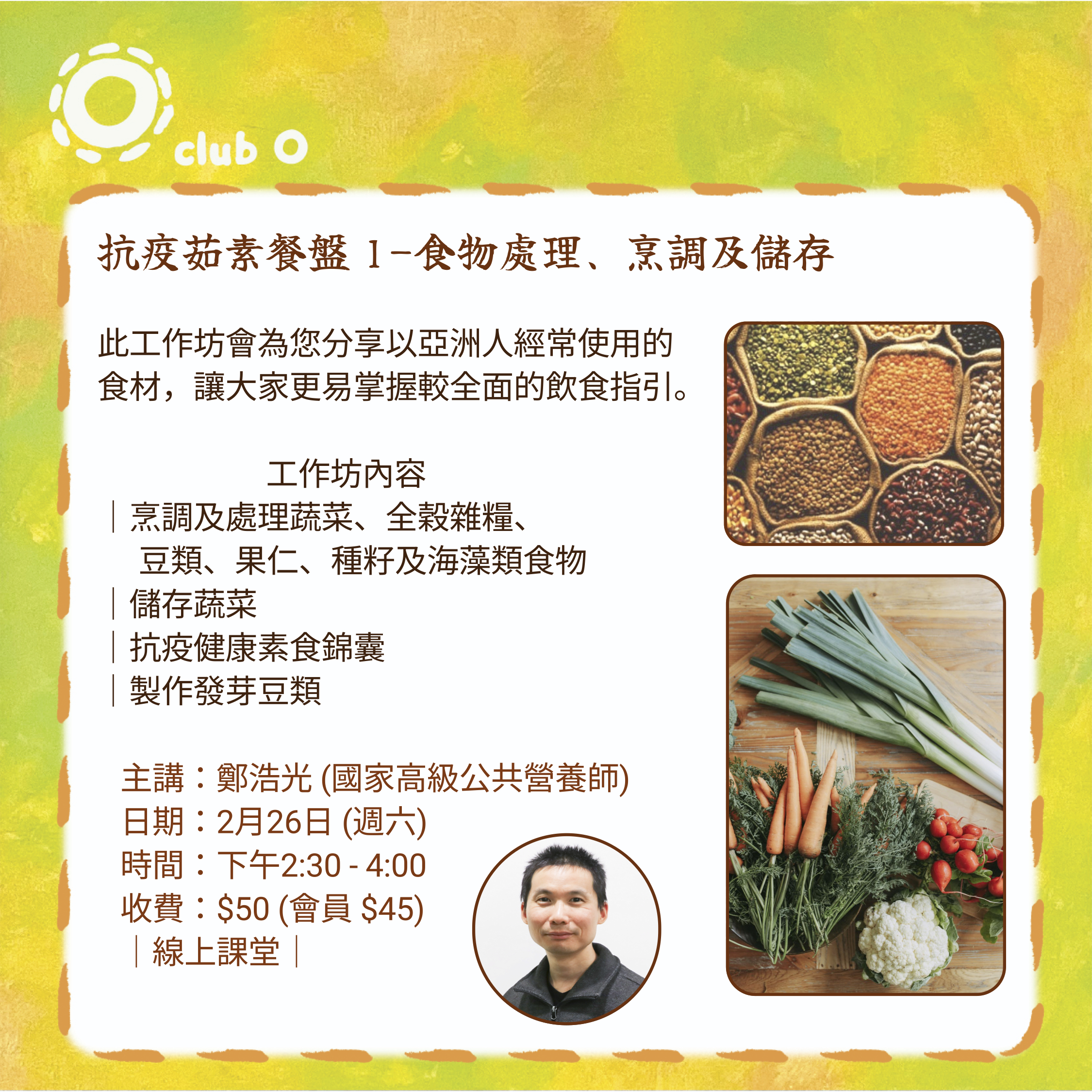 此工作坊會為您分享以亞洲人經常使用的 食材,讓大家更易掌握較全面的飲食指引。 工作坊內容 |烹調及處理蔬菜、全穀雜糧、 豆類、果仁、種籽及海藻類食物 |儲存蔬菜 |抗疫健康素食錦囊 |製作發芽豆類 主講:鄭浩光 (國家高級公共營養師) 日期:2月26日 (週六) 時間:下午2:30 - 4:00 收費:$50 (會員 $45) |線上課堂|