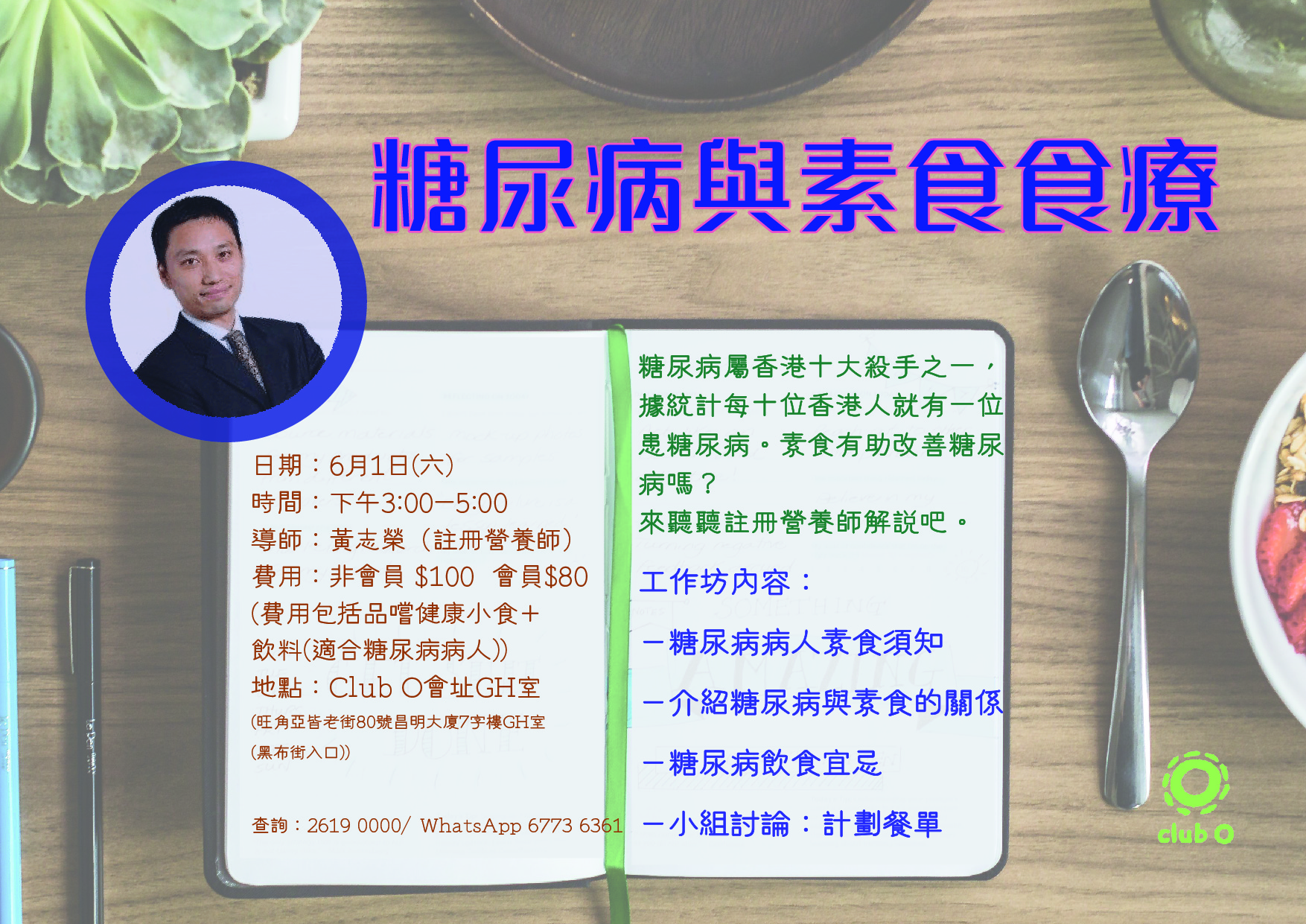 糖尿病屬香港十大殺手之一,據統計每十位香港人就有一位患糖尿病。糖尿病是需要長期料理的疾病,但並非不治之症,只要控制得好,患者一樣可以過正常生活。有研究發現,素食有助改善糖尿病。工作坊會探討: -糖尿病病人素食須知 -介紹糖尿病與素食的關係 -糖尿病飲食宜忌 -小組討論:計劃餐單 日期:6月1日(六) 時間:下午 3:00-5:00 導師:黃志榮(註冊營養師) 費用:非會員 $100 會員$80 (費用包括適合糖尿病病人的健康小食+飲料) 地點:Club O會址GH室 (旺角亞皆老街80號昌明大廈7字樓GH室(黑布街入口)) 查詢:2619 0000/WhatsApp 6773 6361