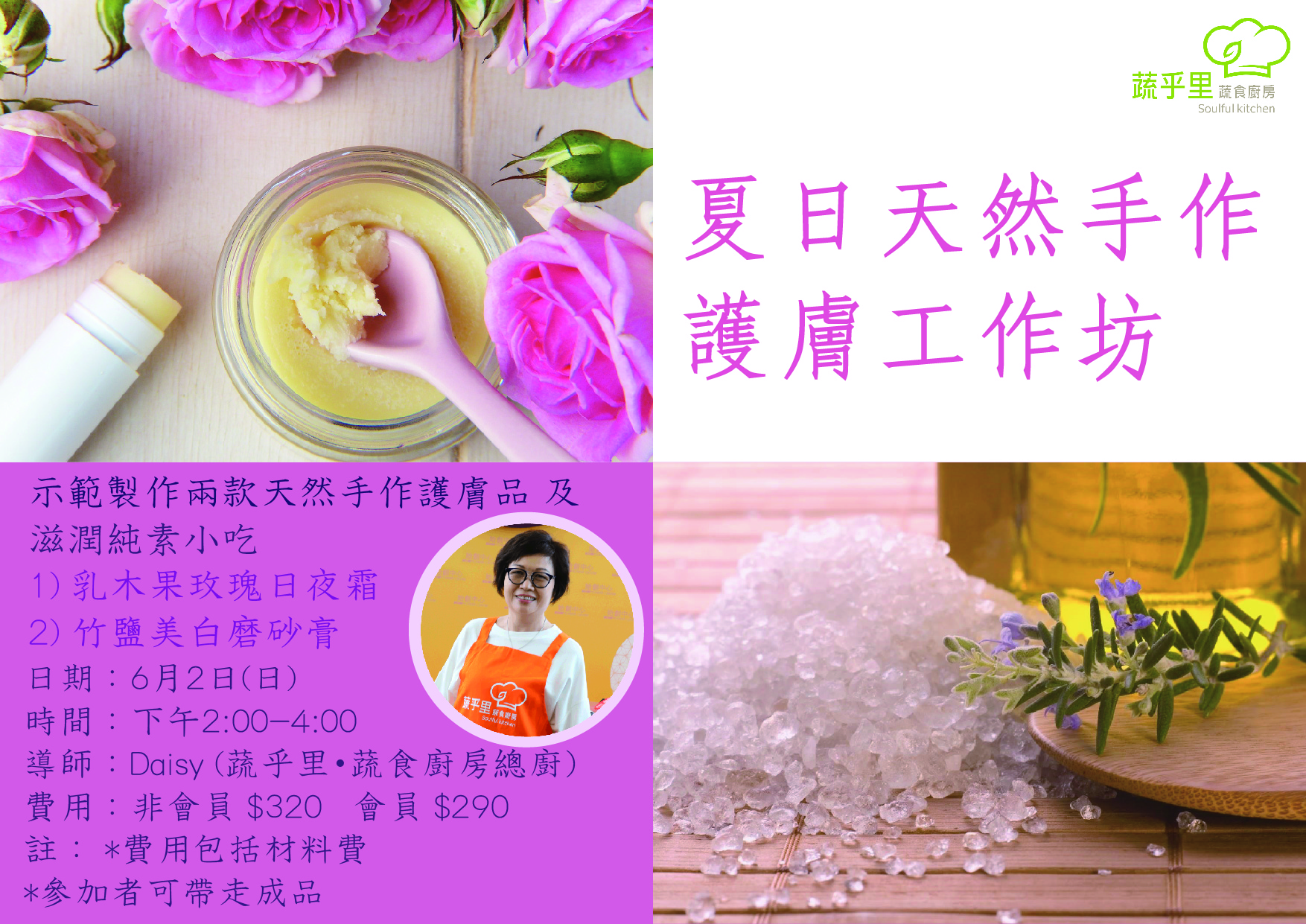 很多人以為冬天才需要保護皮膚,其實夏天的皮膚護理也很重要呢!乳木果脂除了有深層滋潤作用,乳木果油中的一種天然防曬成份-肉桂酸,有效隔離紫外線。工作坊會教大家自製兩款天然手作護膚品,更特意為大家準備了滋潤純素小吃,讓你裡裡外外滋潤無比! 1) 乳木果玫瑰日夜霜 2) 竹鹽美白磨砂膏 3) 滋潤純素小吃:牛蒡茶、麥芽餅、芝麻卷、雪耳杏仁糖水 日期:6月2日(日) 時間:下午2:00-4:00 導師:Daisy (蔬乎里・蔬食廚房總廚) 費用:非會員 $320 會員 $290(費用包括品滋潤純素小吃) 註: *費用包括材料費 *參加者可帶走成品 報名:https://forms.gle/kuLn3yNuFZWX75h98 如有興趣參與此活動,請填妥此登記表格