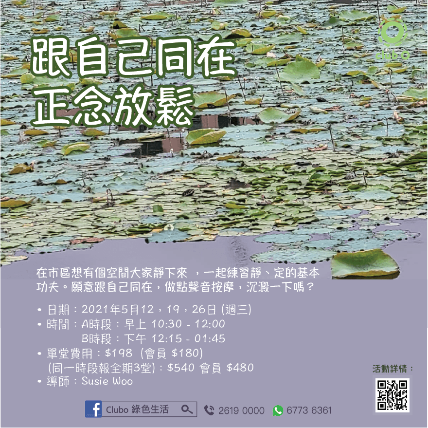 Club O 旺角亞皆老街86號昌明大厦7字樓FGH室靜心練習~恆常做的功課 在市區想有個空間大家靜下來 ,一起練習靜、定的基本功夫。 願意跟自己同在,做點聲音按摩,沉澱一下嗎? 『 打坐時,念頭在打坐上 觀呼吸時,念頭在呼吸上 即是正念 』 正念是修煉的根基,也是療癒的根基。 是日程序~ 1. 靜坐方法介紹:觀呼吸,數息 2. 姿勢及調身、心態的準備 3. 一起練習 4. 下坐大休息,加入頌缽聲頻放鬆 5. 喝水練習,分享及祝福作結 時段*: A:5月12,19,26日 星期三