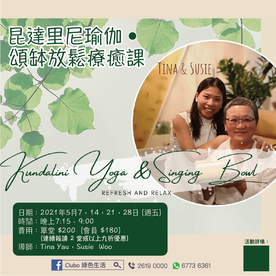 Club O 旺角亞皆老街86號昌明大厦7字樓FGH室導師:Tina Yau,Susie Woo 日期:2021年5月7,14,21,28 日 (星期五) 時間:晚上7:15-9:00 (單堂) $200(會員 $180) (2節或以上九折) 報名: https://forms.gle/S3dy6C23wpiU9mND7 上半節我們會一起練習昆達里尼瑜伽,打開身體, 釋放壓力,調節身心狀態。練習裡包括簡易的身體動作、輕微的手指活動、有意識的改變呼吸節奏、唱頌調節身體頻率等等。 讓我們回歸當下,純粹享受與自己身體和呼吸的連結,感受身體的微妙。 下半節會跟大家一起享受頌缽、唱頌,發放的和諧聲頻振動蔓延全身,讓泛音穿透,給自己細胞深度休息,在享受聲頻振動的過程中,啟動我們自癒的能力。 昆達里尼瑜伽有甚麼好處? 昆達里尼瑜伽裡的動作由瑜伽士精心編排,透過身體的微妙的動作結合呼吸、梵唱及手印,迅速直接向大腦傳達訊息,刺激神經系統,調節身體頻率,淨化並清理中脈及其相連的整個脈輪系統,重新塑造身體系統的模式,讓身心達到自然的平衡。 頌缽音頻療癒有甚麼好處? 人的身心健康,與自身的振動頻率有關,透過頌缽的聲音,可調節人的身心,甚至全身血氣,是一種十分簡單而療效顯著”能量改變能量”的療癒方法。 給自己細胞深度休息,在享受聲頻振動的過程中,啟動我們自癒的能力,既無副作用,又可以改善身心健康,是一項不錯的保健。 【導師簡介】 Tina