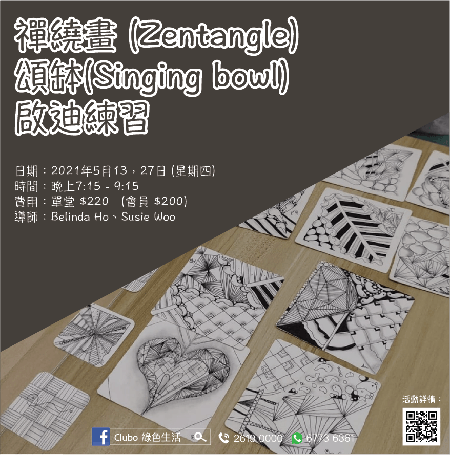 Club O 旺角亞皆老街86號昌明大厦7字樓FGH室導師:Belinda Ho & Susie Woo 初接觸禪繞時, 禪繞形容為腦內瑜伽, 有參加者分享接觸後,除了過程中享受靜心,增加專注力,還可以從中更了解自己個性。 創作前,會在頌缽聲頻調頻下,回到跟自己連結的狀態。在創造過程中,回到當下,體驗內在的平靜。 完成作品後,再專注在作品中,細細體味。 參加者不需有藝術基礎。你畫的不只是一副拼湊的圖案,而是一場無可替代的啟發!今次在不同黑與白之間體驗,我們跳出框框創造畫作,同時探索與人創作圖作,增強對四周環境的欣賞,建立正面生活態度。 導師:Susie Woo 日期:5月13,27日 星期四 時間:下午 7:15 - 9:15 費用:(單堂) 每位$220(會員 $200) (同時報2堂或以上可享九折優惠) 堂上可借用工具