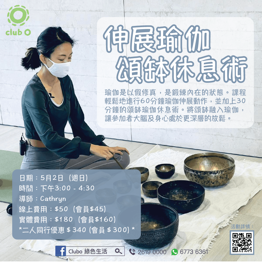 Club O 旺角亞皆老街86號昌明大厦7字樓FGH室《伸展瑜珈x頌缽休息術》Relaxation stretching with singing bowl - 實體課程+線上活動 導師:Cathryn Yu (印度傳統瑜伽導師) 日期:5月2日 (週日) 時間:下午3:00 - 4:30 實體收費:$180 (會員 $160) 【二人同行優惠$340(會員$300)】 線上收費:$50 (會員 $45) 瑜伽是以假修真,是鍛練內在的狀態。課程輕鬆地進行 60