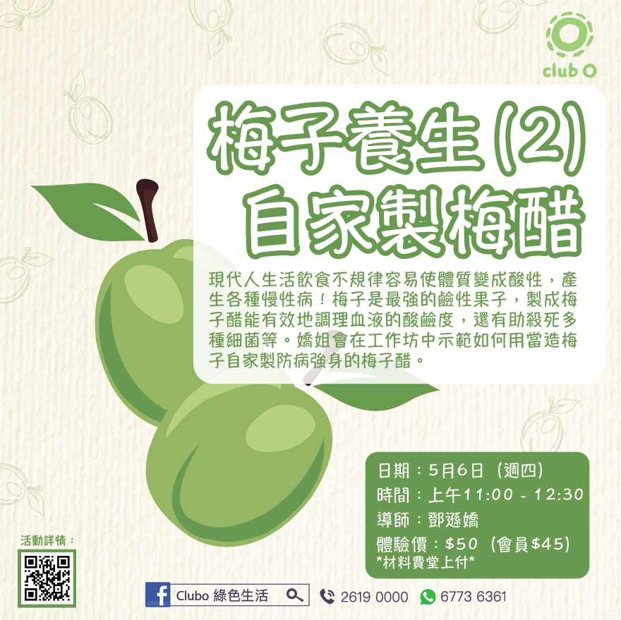 Club O 旺角亞皆老街86號昌明大厦7字樓FGH室《亮星星小敘 -梅子養生(2) 自家製梅醋》- 實體活動 主持:嬌姐 日期:5月6日 (週四) 時間:上午11:00 – 中午12:30 收費:$50 (會員$45 ) *材料費堂上付* 現代人經常捱夜、多吃肉及加工食物,生活飲食不規律使體質變成酸性,產生各種慢性病!梅子是最強的鹼性果子,梅子醋含有數十種天然有机酸如檸檬酸、蘋果酸、琥珀酸、兒茶酸等,能有效地調理血液的酸鹼度,還有助殺死多種細菌、真菌、幽門螺旋菌等。嬌姐是農產加工品達人,她會在工作坊中示範如何用當造梅子自家製防病強身的梅子醋。 導師簡介 : 嬌姐曾務農,善長把當造的蔬果加工成風味甘香的乾品、醬、醃漬物、醋等。近年她加入了綠野林的食生廚房,為有緣人泡製生機美食,食生後她多年病患不藥而癒了。 ------------------------------------------------------------------- 報名表:https://forms.gle/4gw4yXSoFU2g4JvaA ------------------------------------------------------------------- 馬上申請成為Club O會員, 享有會員優惠: