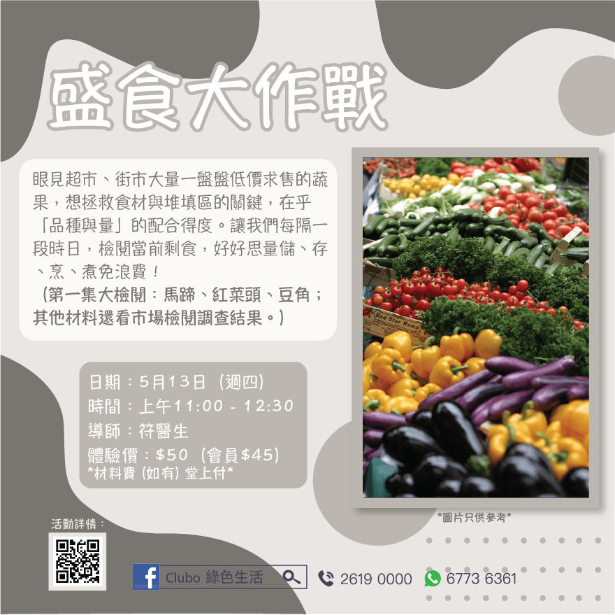 Club O 旺角亞皆老街86號昌明大厦7字樓FGH室《盛食大作戰》- 實體活動 主持:符慧敏醫生 大家可有類似經驗:眼見超市、街市大量一盤盤低價求售的蔬果,一天半天後有機會因為種種原因步入堆填命運,而心有戚戚? 「品種與量」的配合得度,就是拯救食材與堆填區的關鍵。讓我們每隔一段時日,找一個半天,檢閱當前剩食,好好思量儲、存、烹、煮免浪費! 第一集大檢閱:馬蹄、紅菜頭、豆角;其他材料還看市場檢閱調查結果。 ------------------------------------------------------------------- 報名表:https://forms.gle/4gw4yXSoFU2g4JvaA ------------------------------------------------------------------- 馬上申請成為Club O會員, 享有會員優惠: https://forms.gle/p5tfx2Cjir9Uy5EU8 * * * * * * * * * * *
