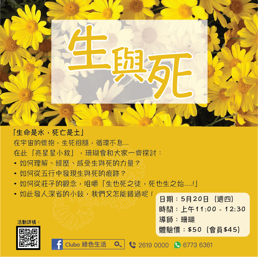 Club O 旺角亞皆老街86號昌明大厦7字樓FGH室《亮星星小敘-生與死》- 實體活動 主持:珊瑚 「生命是水,死亡是土」 在宇宙的懷抱,生死相隨,循環不息... 在此「亮星星小敘」,珊瑚會和大家一齊探討: • 如何理解、經歷、感受生與死的力量? • 如何從五行中發現生與死的痕跡? • 如何從莊子的觀念,咀嚼「生也死之徒,死也生之始....!」 • 如此發人深省的小鈙,我們又怎能錯過呢! 分享者:珊瑚 - 對天地萬物常存敬仰之心,多年來投入養 ------------------------------------------------------------------- 報名表:https://forms.gle/4gw4yXSoFU2g4JvaA ------------------------------------------------------------------- 馬上申請成為Club O會員, 享有會員優惠: https://forms.gle/p5tfx2Cjir9Uy5EU8