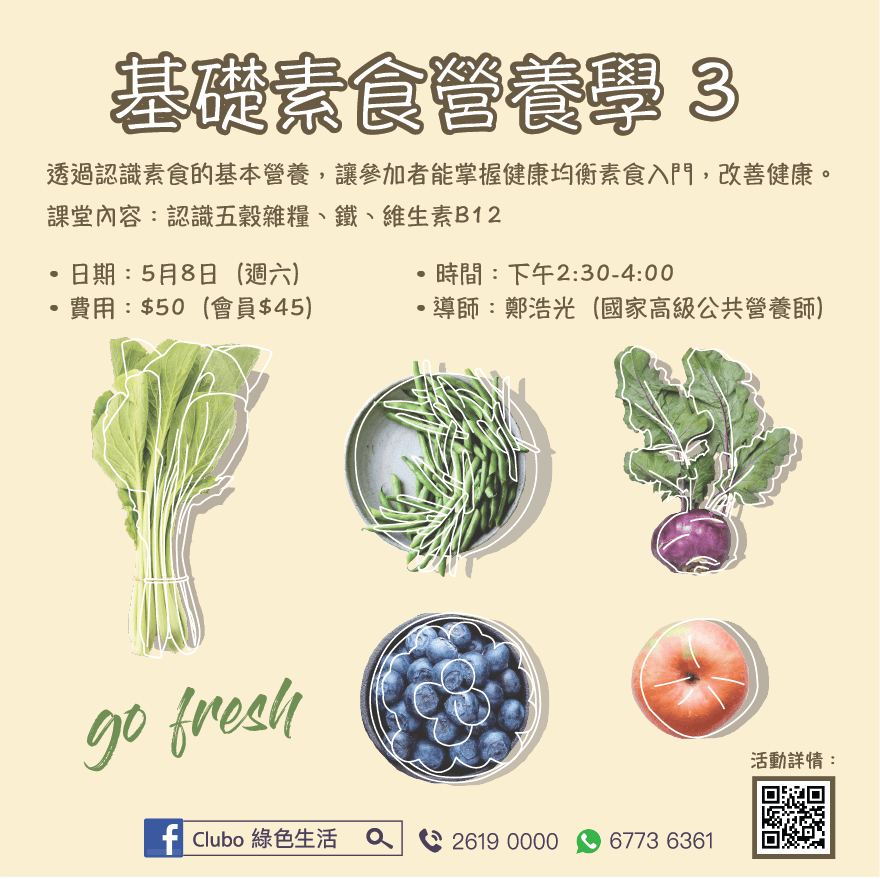 《基礎素食營養學 3》- 線上活動 主持:鄭浩光 (國家高級公共營養師) 收費:$50 (會員$45 ) 透過認識素食的基本營養,讓參加者能撑握健康均衡素食的入門,改善健康。 內容: 認識五穀雜糧:即使飲食清淡,滴油不沾,也可能導致血脂偏高及血糖不穩。與大家探討個中原因,如何選擇適當的食物,以及有效改善及預防「三高」(高血壓、高血糖、高血脂) 問題。 認識鐵:鐵是十分重要的營養素。從植物性食物吸收鐵比較慢,所以素食者需特別注有足夠的補充。分享這些營養素的重要性、食物來源、素食者預防貧血小技巧,以及如何增加吸收率。 認識維生素B12:維生素B12是一種很特殊的營養素。牠屬於水溶性維生素,但擁有一些完全不同的屬性。維生素B12更是素食者比較容易缺乏的營養素,所以是最被關注及最具爭議性的維生素。缺乏維生素B12,除會導致貧血外,還會引致其他嚴重疾病,故建議素食者需特別留意。講解維生素B12對人體的重要性及食物來源。 ------------------------------------------------------------------- 報名表:https://forms.gle/4gw4yXSoFU2g4JvaA ------------------------------------------------------------------- 馬上申請成為Club O會員, 享有會員優惠: https://forms.gle/p5tfx2Cjir9Uy5EU8 * * *