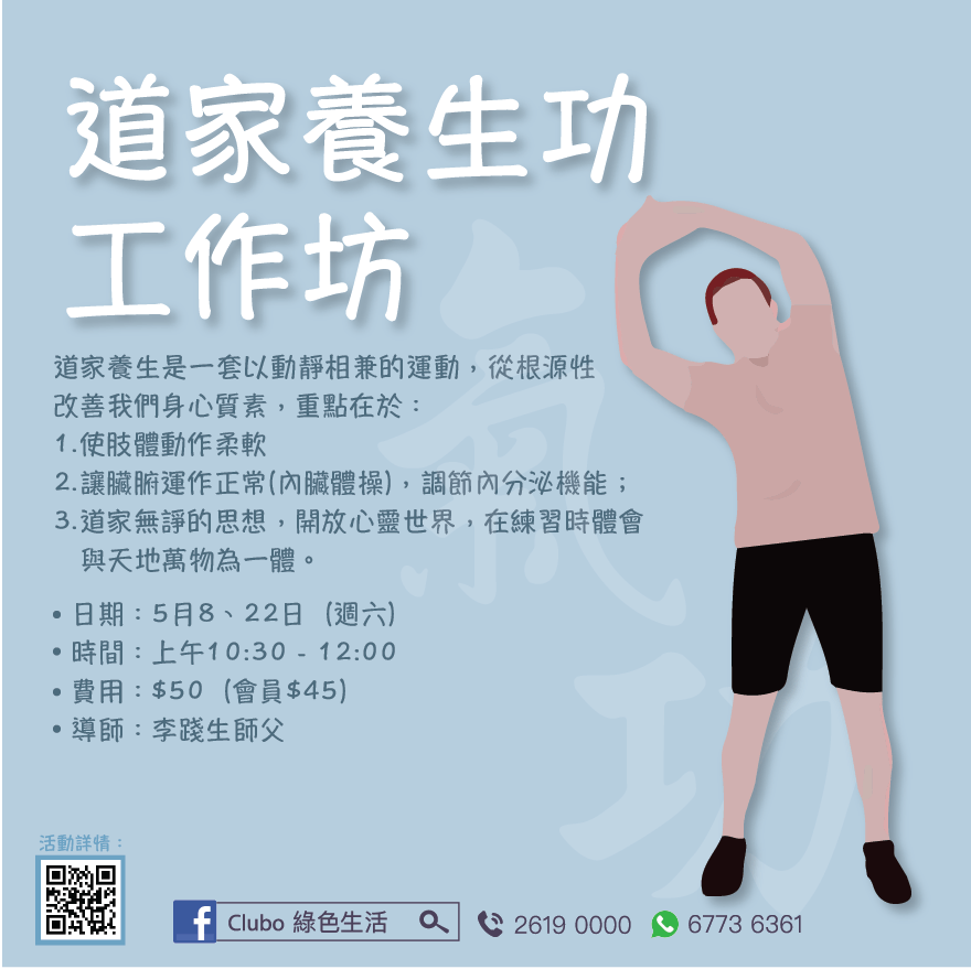 Club O 旺角亞皆老街86號昌明大厦7字樓FGH室《道家養生功工作坊》 主講:李踐生師父 收費:$50 (會員 $45) 道家養生是一套已動靜相兼的運動,從根源性改善我們身心質素,重點在於: 1.使肢體動作柔軟 2.讓臟腑運作正常(內臟體操),調節內分泌機能; 3.道家無諍的思想,開放心靈世界,在練習時體會與天地萬物為一體。 *歡迎新生參加* 【導師簡介】 自80年代起,李師父分別學習了鶴翔莊氣功、道家養生功、六字訣、太極功。 94年開始在法注文化書院修讀佛學和道家思想,許多功法都是源於道家修身和修心的精神脉絡。李師父不是佛教徒或道教徒,但非常欣賞佛家和道家思想。 95年開始教功,全是義務性質,沒有門派和師徒的形式主義。其一是基於個人興趣。其二是發出一個訊息,「身心健康」需要自己負責的,通過練習氣功和運動幫助體質提升。 ------------------------------------------------------------------------------------------------------------ 報名表:https://forms.gle/4gw4yXSoFU2g4JvaA ------------------------------------------------------------------------------------------------------------ 馬上申請成為Club O會員, 享有會員優惠: https://forms.gle/p5tfx2Cjir9Uy5EU8 * * *