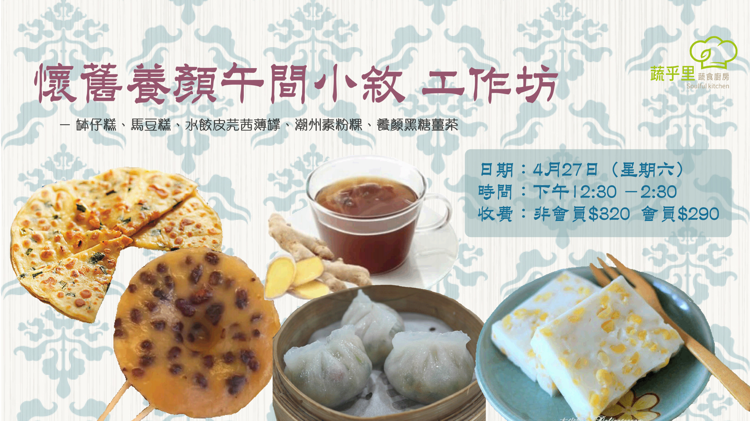 有沒有發覺懷舊小吃現在買少見少了? 偶爾想吃吃兒時嘗過的味道,卻發覺現在在外邊已經很難找到對味的。 想重拾童年回憶嗎? 星期六特別加插了特備午間節目:懷舊養顏午間小敘。導師Linda即場教授缽仔糕、馬豆糕、水餃皮芫茜薄罉、潮州素粉粿的製作方法後,大家一起品嚐,配上一杯由Daisy(蔬乎里蔬食廚房總廚)特別炮製的養顏黑糖薑茶。 喔~好想即刻話當年呢⋯⋯ 當天歡迎自備食物盒, 可以帶少量成品回家跟家人分享。 內容: ① 缽仔糕 ② 馬豆糕 ③ 水餃皮芫茜薄罉 ④ 潮州素粉粿 ⑤ 養顏黑糖薑茶 日期:4月27日(星期六) 時間:下午12:30-2:30 地點:Club