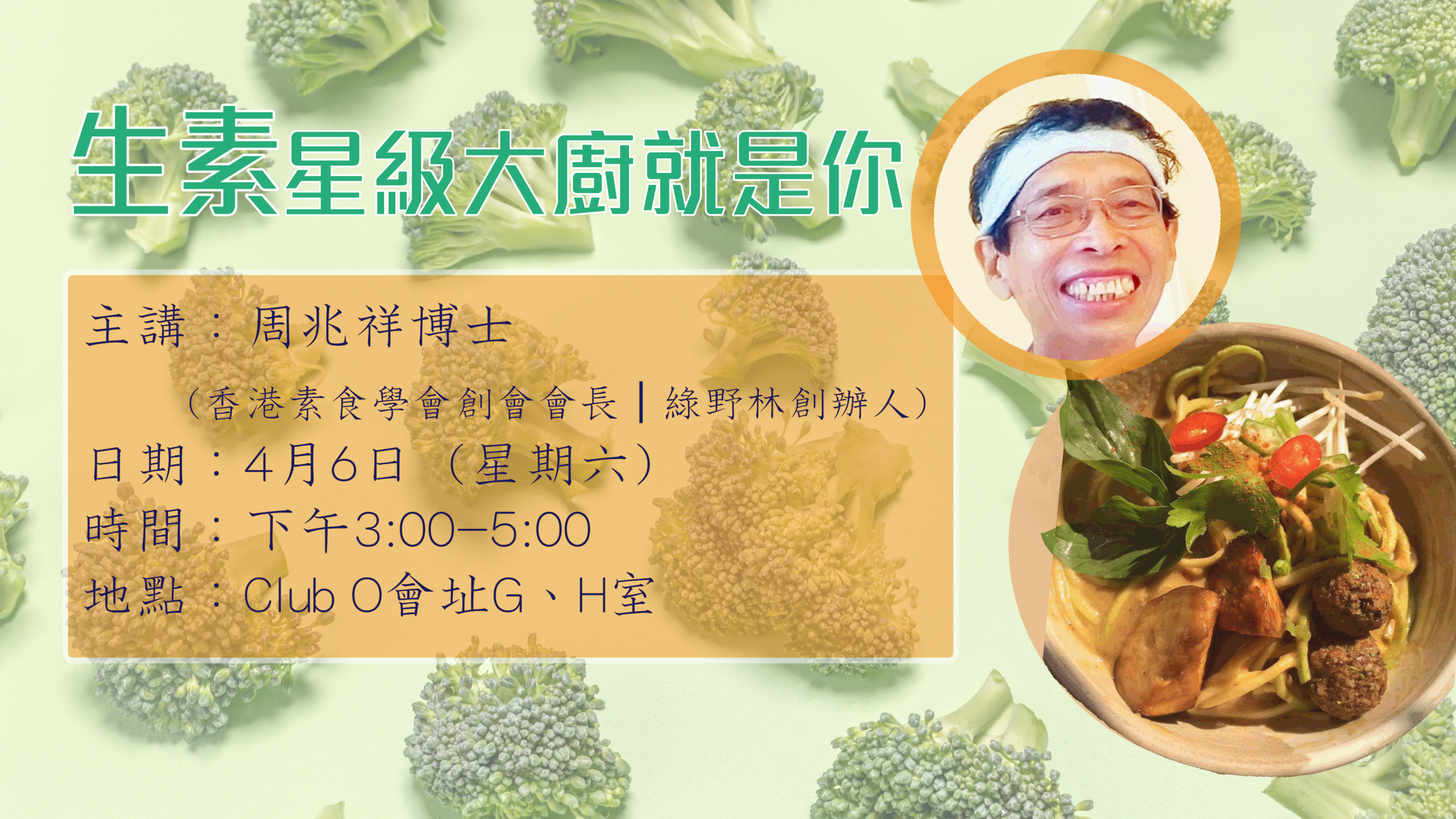 食嘢食味道,食物即使怎樣有益又慈悲,若味道難頂,也不容易長期習慣食,所以做素食做食生菜式,能夠掌握調味的秘訣,自然事半功倍。 原來做食生美食想樣樣可口,一點也不困難:先了解味覺吸引力的基本原理,然後認識可以使用的種種調味料、熟悉它們的用法和性質,那麼非常簡單馬上升級成為人人歡迎的生素廚師,天天下廚得心應有,令自己和家人朋友長期開心食出健康食出愛。 來看祥哥分享三四十年的做素食調味心得,聽他介紹和示範,現場品嘗他拿手的種種美食。 主題:生素廚藝美味的理論與實踐 主講:周兆祥博士(香港素食學會創會會長|綠野林創辦人) 日期 時間:4月6日(星期六)下午3:00-5:00 地點:Club O會址GH室 費用:非會員$50 會員$40 查詢:2619 0000/WhatsApp 6773 6361 報名:https://goo.gl/forms/9jGKMaYcqkRRgjMc2