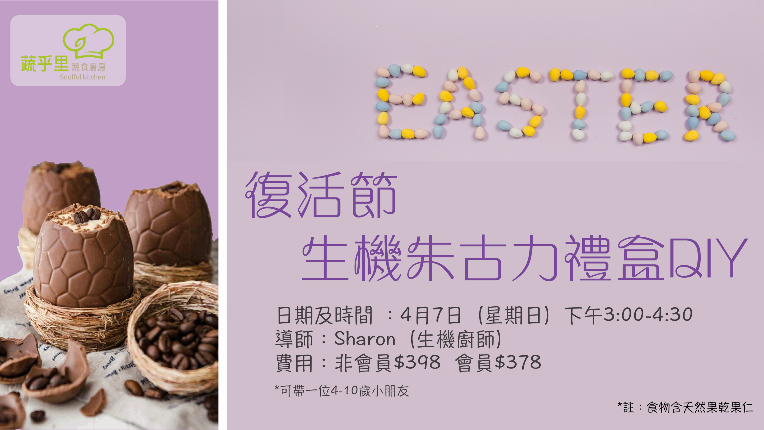 日期:4月7日(星期日) 時間:下午3:00-4:30 導師:Sharon(生機廚師) 內容: 1.生機朱古力橙片 2.雜錦朱古力復活蛋 3.香橙倒模朱古力棒 4.椰棗㚒心朱古力 學習朱古力調溫技巧,製作4款朱古力。完成作品可攜帶回家品嚐和分享。食物含天然果乾果仁。 費用:非會員$398 會員$378 註: • 可免費帶一位4-10歲小朋友,額外攜帶小朋友需另付入場費$100/位 網上報名:https://goo.gl/forms/hFnOsf2mGRMAI2t92
