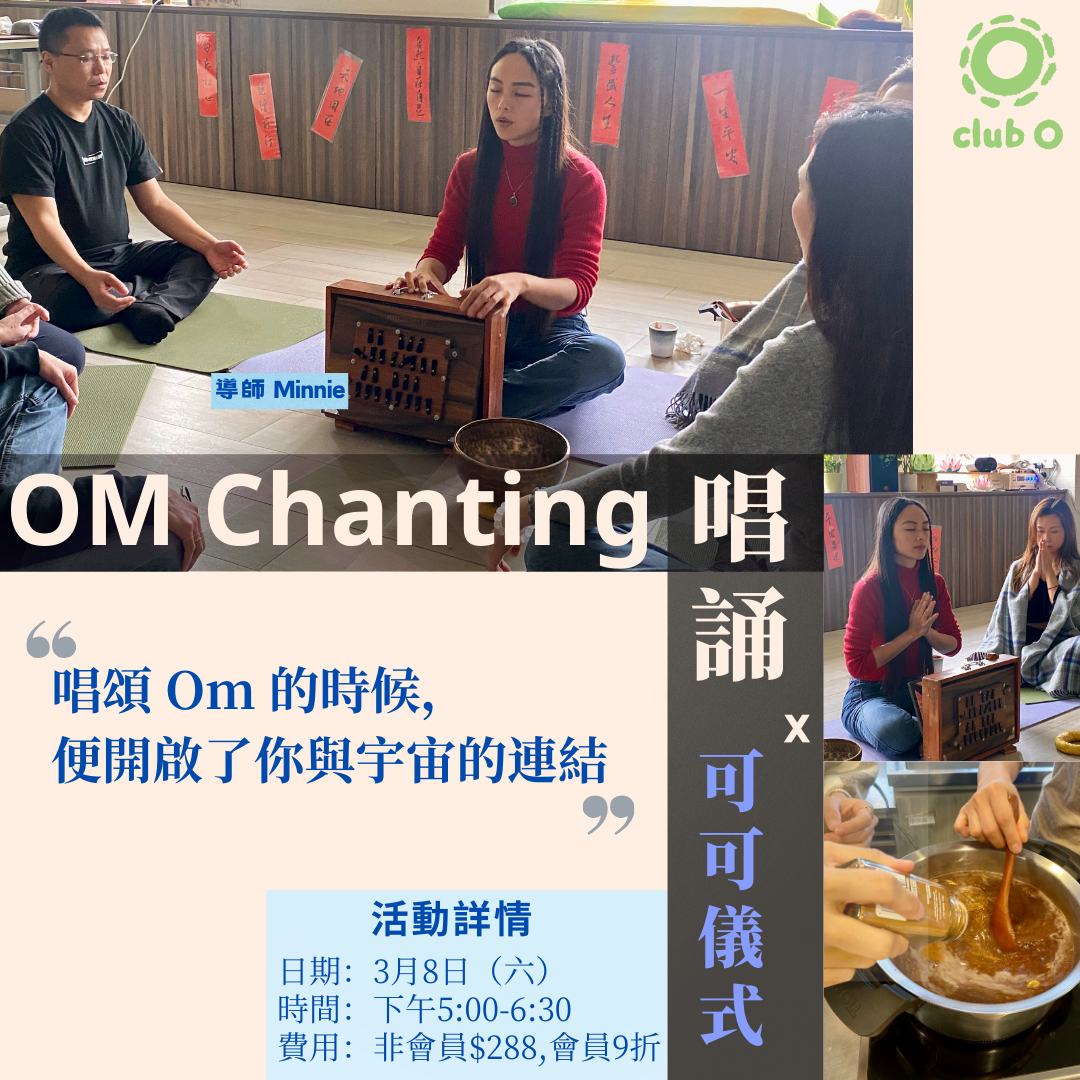 Club O 旺角亞皆老街86號昌明大厦7字樓FGH室OM Chanting + 可可儀式 日期:3月8日(六) 時間:下午 5:00-6:30 收費:$288/$260(會員) 地址:九龍旺角亞皆老街86號昌明大廈7樓F室