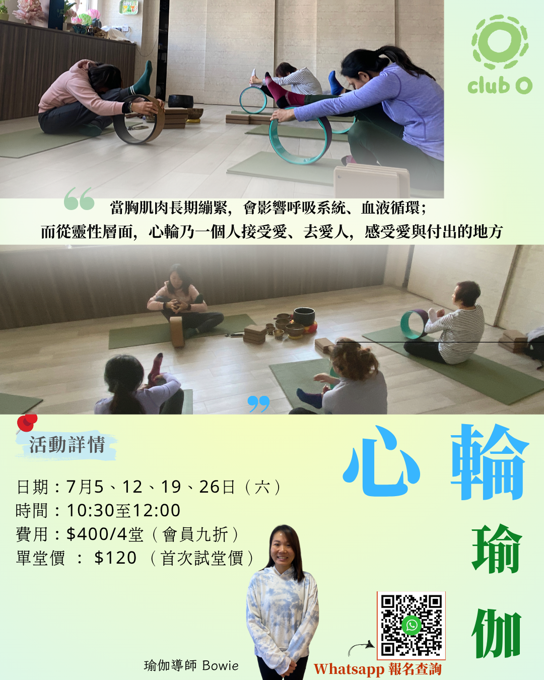 Club O 旺角亞皆老街86號昌明大厦7字樓FGH室心輪。輪瑜珈 日期:7月5、12、19、26日(六) 時間:上午10:30 - 12:00 地點:九龍旺角亞皆老街86號昌明大廈7樓F室 收費:$400/月 ; 會員9折$360 ; 單堂價 $120 (月費需兩個月內完成) 導師:Bowie ▌Google Form 報名:https://forms.gle/Nwc9WACTDsJqYGR57 ▌查詢詳情 2619 0000 │ WhatsApp 6773 6361 https://wa.me/85267736361