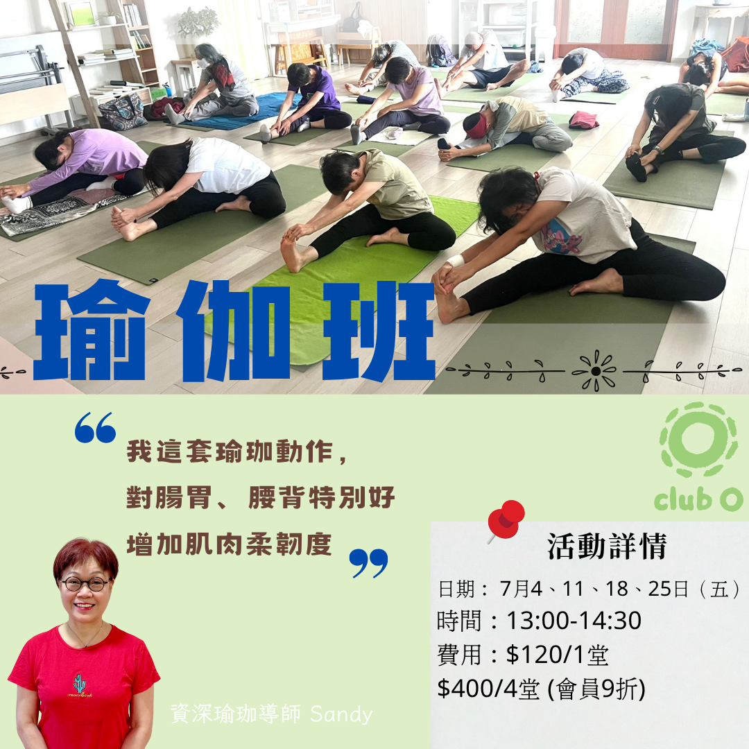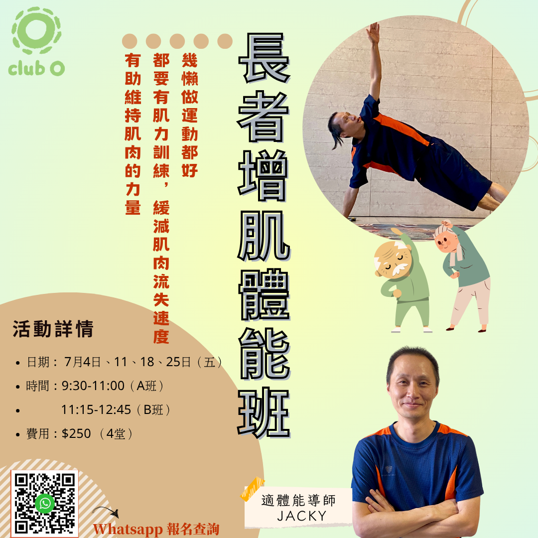 Club O 旺角亞皆老街86號昌明大厦7字樓FGH室名稱: 長者增肌體態班( 進階) 日期: 7月7,14,21,28 (星期一) 時間: 上午10:00-11:30 收費: 每月4堂$250/月 體能導師: Jacky