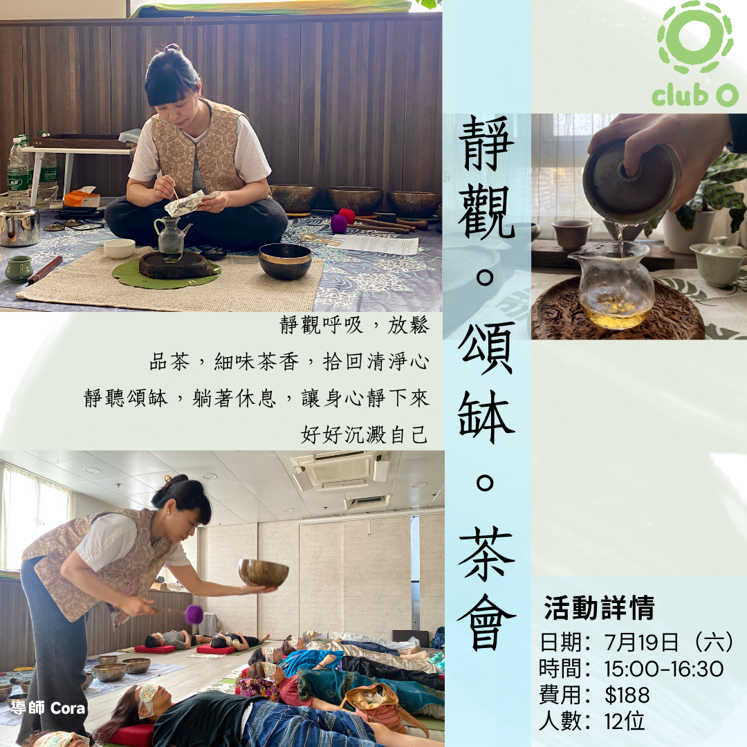 名稱: 盛夏[靜觀。頌缽。茶會] 日期: 2025年7月19日(六) 時間: 下午 3:00 - 4:30pm 導師 Cora 人數: 12人 收費: 188 ( 劃一價)