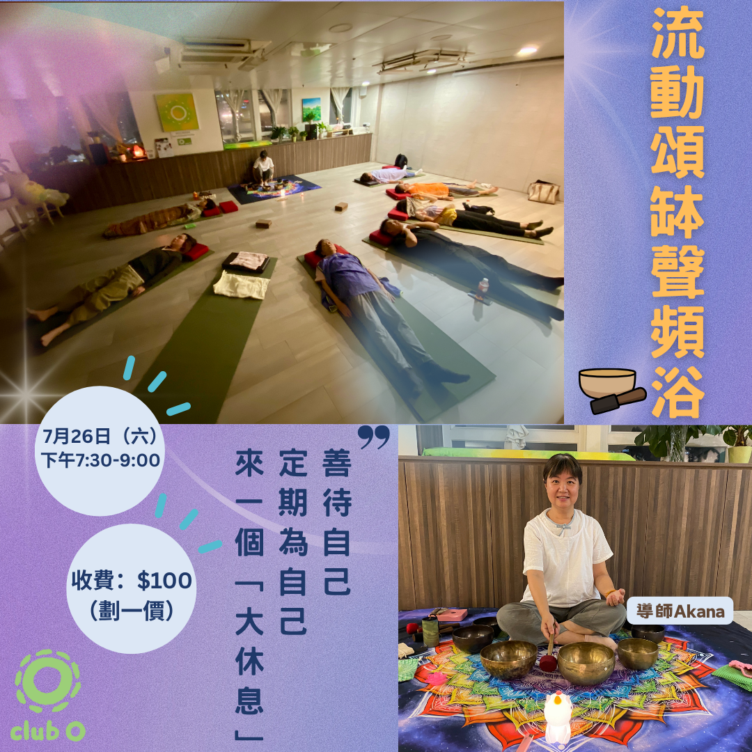 名稱: 流動頌缽聲頻浴 日期: 2025年7月26日(六) 時間: 晚上 7:30 - 9:00 收費: $100 (劃一價) 人數上限: 20人 導師: Akana Au Yeung