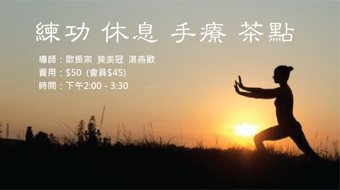 Club O 旺角亞皆老街86號昌明大厦7字樓FGH室道家養生是一套已動靜相兼的運動,從根源性改善我們身心質素,重點在於: 1.使肢體動作柔軟 2.讓臟腑運作正常(內臟體操),調節內分泌機能; 3.道家無諍的思想,開放心靈世界,在練習時體會與天地萬物為一體。 主持:李踐生師父 日期:11月14、28日 (週六) 時間:下午2:30 – 4:00 地點:GH室 收費:$50 (會員 $45) 各位參加者需預先留座,不設Walk-in,如若成功Club O 會容後透過 WhatsApp 通知您。 –網上報名表:https://forms.gle/GWxP8BTErp51w7g19 —————————————- 馬上申請成為Club O會員, 享有會員優惠: