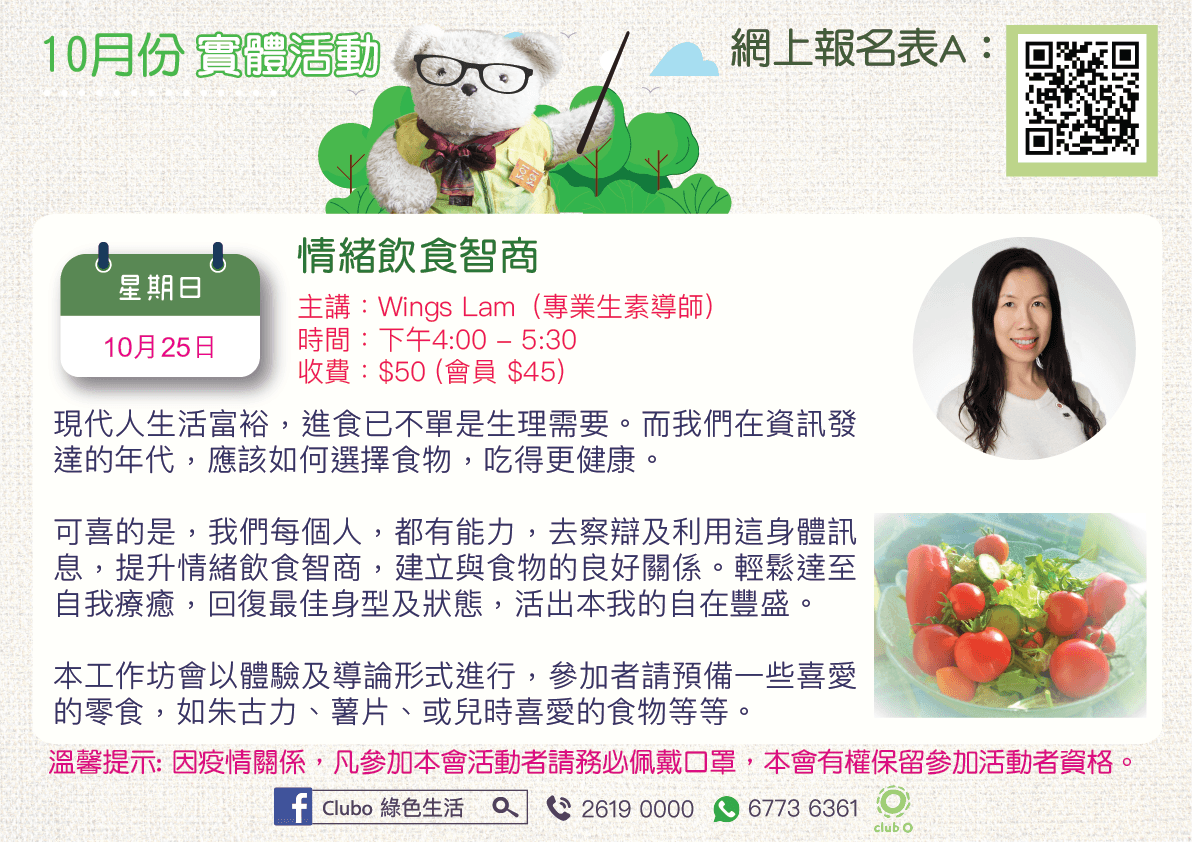 Club O 旺角亞皆老街86號昌明大厦7字樓FGH室我的茹素餐盤(2) – 餐單設計 現代人生活富裕,進食已不單是生理需要 而我們在資訊發達的年代,人們都有足夠認知,如何選擇食物, 吃得更健康。然而在日常生活中,往往身不由己,理性上知道 要吃的「健康食物」,到真正選擇時,好像每時每刻都有一種 無形的內在交戰。 內心的力量往往比頭腦大,於是日復一日,在飲食與選擇之間, 惰入無止境的不良偱環,生活為飲食課題,內耗龐大能量。 可喜的是,我們每個人,都有能力,去察辯及利用這身體訊息, 提升情緒飲食智商,建立與食物的良好關係。輕鬆達至自我療 癒,回復最佳身型及狀態,活出本我的自在豐盛。 本工作坊會以體驗及導論形式進行,參加者請預備一些喜愛的零食,如朱古力、薯片、或兒時喜愛的食物等等。 主講:Wings Lam (專業生素導師) 日期:10月24日 (週日) 時間:下午4:30 – 25:00 地點:GH室 收費:$50