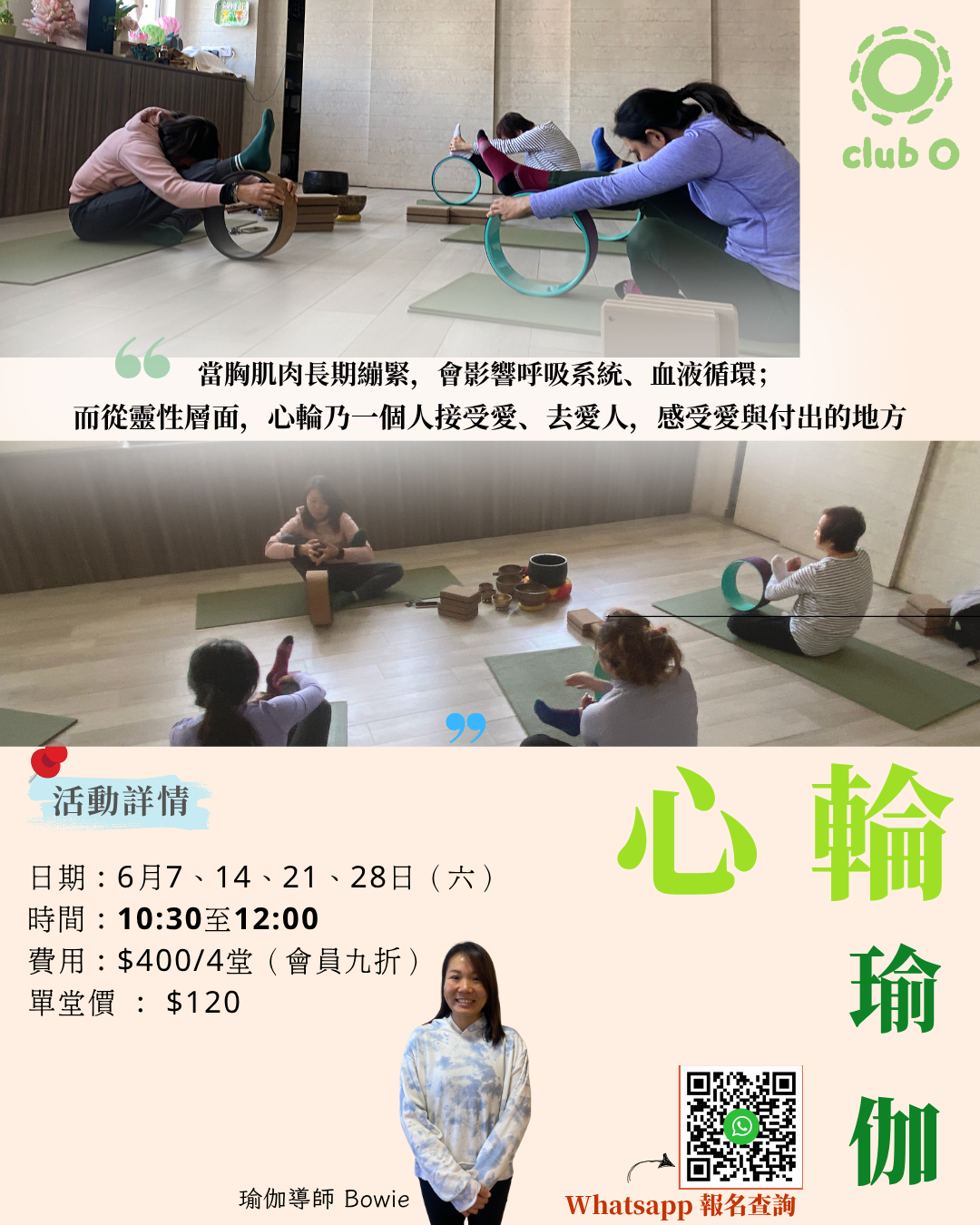 Club O 旺角亞皆老街86號昌明大厦7字樓FGH室心輪。輪瑜珈 日期:6月7、14、21、28日(六) 時間:上午10:30 - 12:00 地點:九龍旺角亞皆老街86號昌明大廈7樓F室 收費:$400/月 ; 會員9折$360 ; 單堂價 $120 (月費需兩個月內完成) 導師:Bowie ▌Google Form 報名:https://forms.gle/iT9wKqvXW4VcPrxa6 ▌查詢詳情 2619 0000 │ WhatsApp 6773 6361