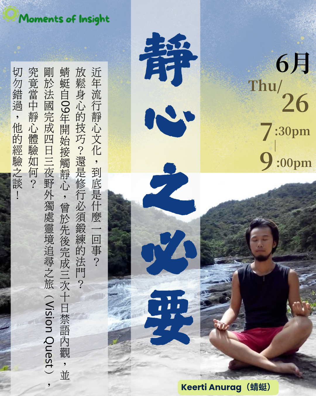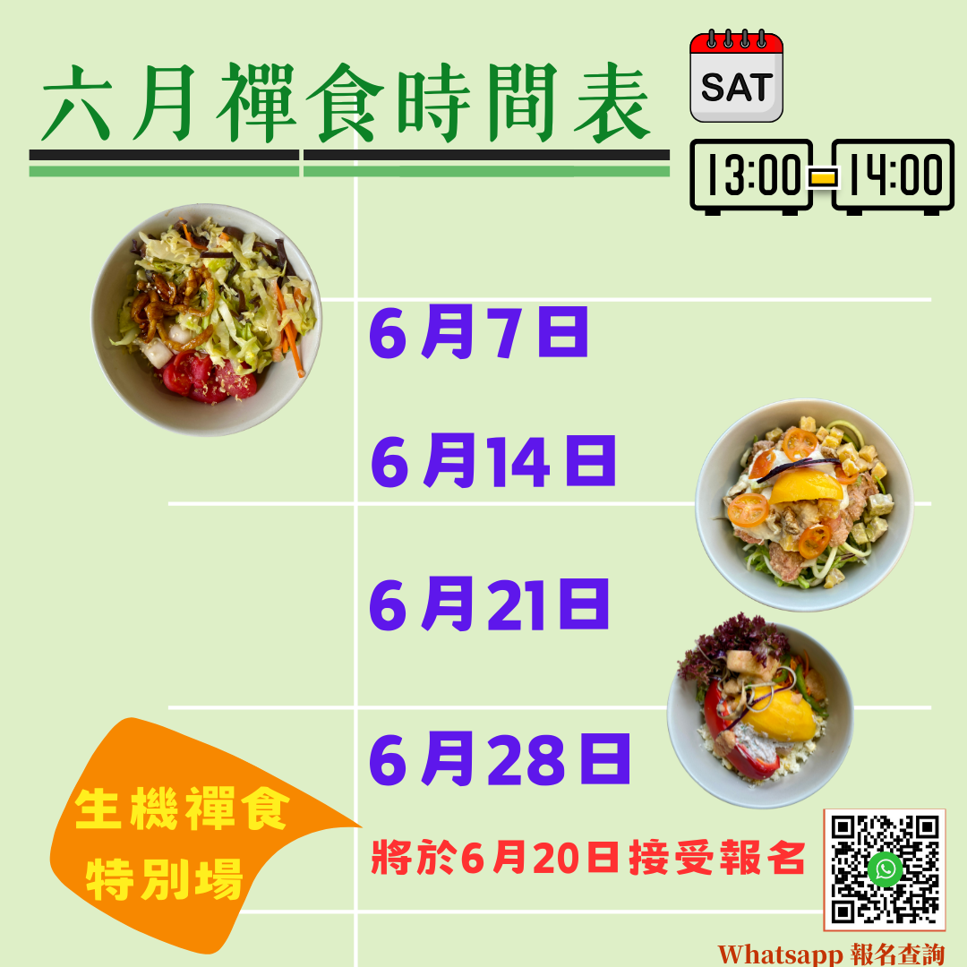 第十屆 21天素食挑戰 日期:6月20日、27日(周五晚上7:00-9:00);7月 5、12日(周六禪午後2:30-4:30) 共四堂 時間:周五晚上7:00-9:00;周六禪午後2:30-4:30 地點:九龍旺角亞皆老街86號昌明大廈7樓F室 收費:$1200(Club O會員$1080;學生$980) 導師:Daisy,黃浚華、Ken、Michelle ▌Google Form 報名:https://forms.gle/TBEJKAxuhh2acS626 ▌查詢詳情 2619 0000 │ WhatsApp 6773 6361 https://wa.me/85267736361