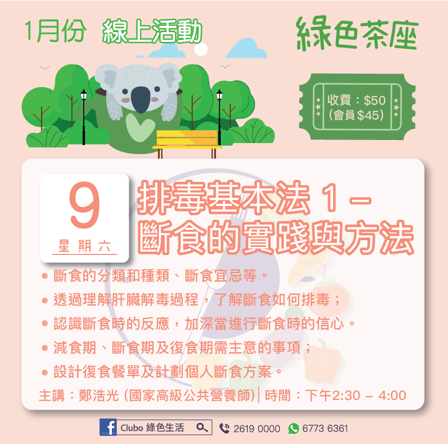 Club O 旺角亞皆老街86號昌明大厦7字樓FGH室主講:鄭浩光 (國家高級公共營養師) 日期:1月9日 (週六) 時間:下午2:30 - 4:00 收費:$50 (會員 $45) 線上課堂 斷食是自然醫學很重要的療癒及保健方法。此課堂會分享斷食的分類和種類、斷食宜忌等。透過理解肝臟解毒過程,了解斷食如何排毒,認識斷食時的反應,加深當進行斷食時的信心。更會分享減食期、斷食期及復食期需主意的事項,設計復食餐單及計劃個人斷食方案。讓大家可輕鬆及安全地進行斷食。 ------------------------------------------------------------------- 報名表:https://forms.gle/HX5rzYHgGNk4oSuv7 ------------------------------------------------------------------- 馬上申請成為Club O會員, 享有會員優惠: https://forms.gle/p5tfx2Cjir9Uy5EU8 * * * * *