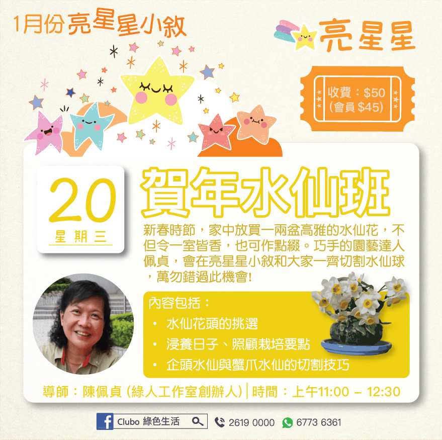 Club O 旺角亞皆老街86號昌明大厦7字樓FGH室《賀年水仙班》 主講:陳佩貞 (綠色工作坊創辦人) 日期:1月20日 (週三) 時間:上午11:00 - 12:30 收費:$50 (會員 $45) 實體課堂 新春時節,家中放買一兩盆高雅的水仙花,不但令一室皆香,也可作點綴, 水仙花的花如其名,如仙女的花朵清香脫俗,這仙子亭亭玉立於清波之上,送上思念、團圓等意頭。巧手的園藝達人佩貞,會在亮星星小敘和大家一齊切割水仙球,萬勿錯過此機會! 內容包括: • 水仙花頭的挑選 • 浸養日子、照顧栽培要點 • 企頭水仙與蟹爪水仙的切割技巧 ------------------------------------------------------------------- 報名表:https://forms.gle/HX5rzYHgGNk4oSuv7 -------------------------------------------------------------------