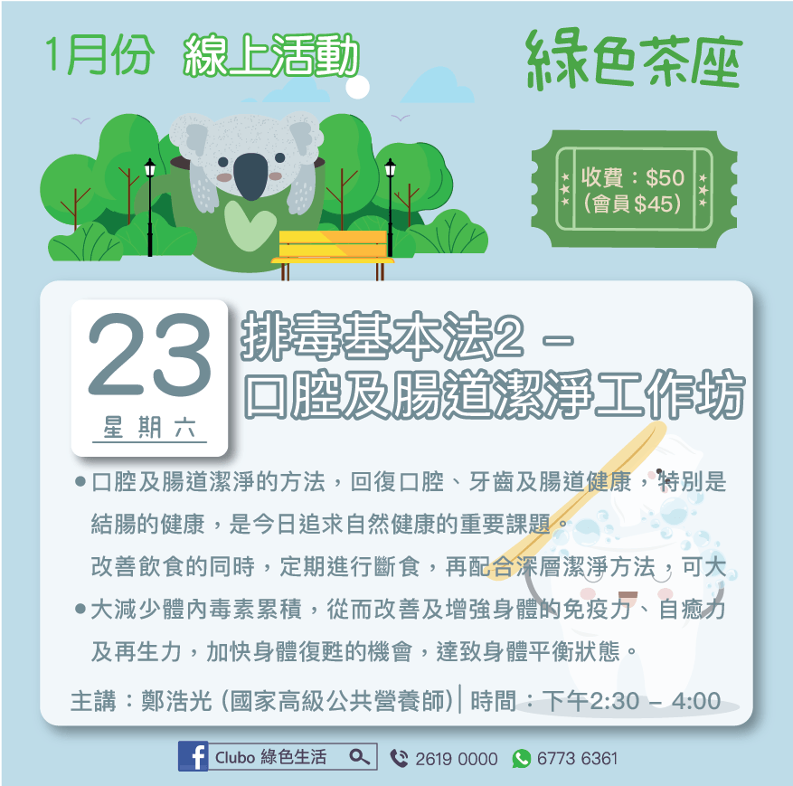 Club O 旺角亞皆老街86號昌明大厦7字樓FGH室主講:鄭浩光 (國家高級公共營養師) 日期:1月23日 (週六) 時間:下午2:30 - 4:00 收費:$50 (會員 $45) 線上課堂 身體是一座製毒工廠!即使吃得健康、無病無痛,人體也會自行製造毒素。因此,要讓身體保持健康,第一步就是不要繼續吃有毒的食物;第二步,則是要把毒素排出來! 此工作坊會與大家分享: 口腔及腸道潔淨的方法,回復口腔、牙齒及腸道健康,特別是結腸的健康,是今日追求自然健康的重要課題。 改善飲食的同時,定期進行斷食,再配合深層潔淨方法,可大大減少體內毒素累積,從而改善及增強身體的免疫力、自癒力及再生力,加快身體復甦的機會,達致身體平衡狀態。 ------------------------------------------------------------------- 報名表:https://forms.gle/HX5rzYHgGNk4oSuv7 ------------------------------------------------------------------- 馬上申請成為Club O會員, 享有會員優惠: https://forms.gle/p5tfx2Cjir9Uy5EU8 * *