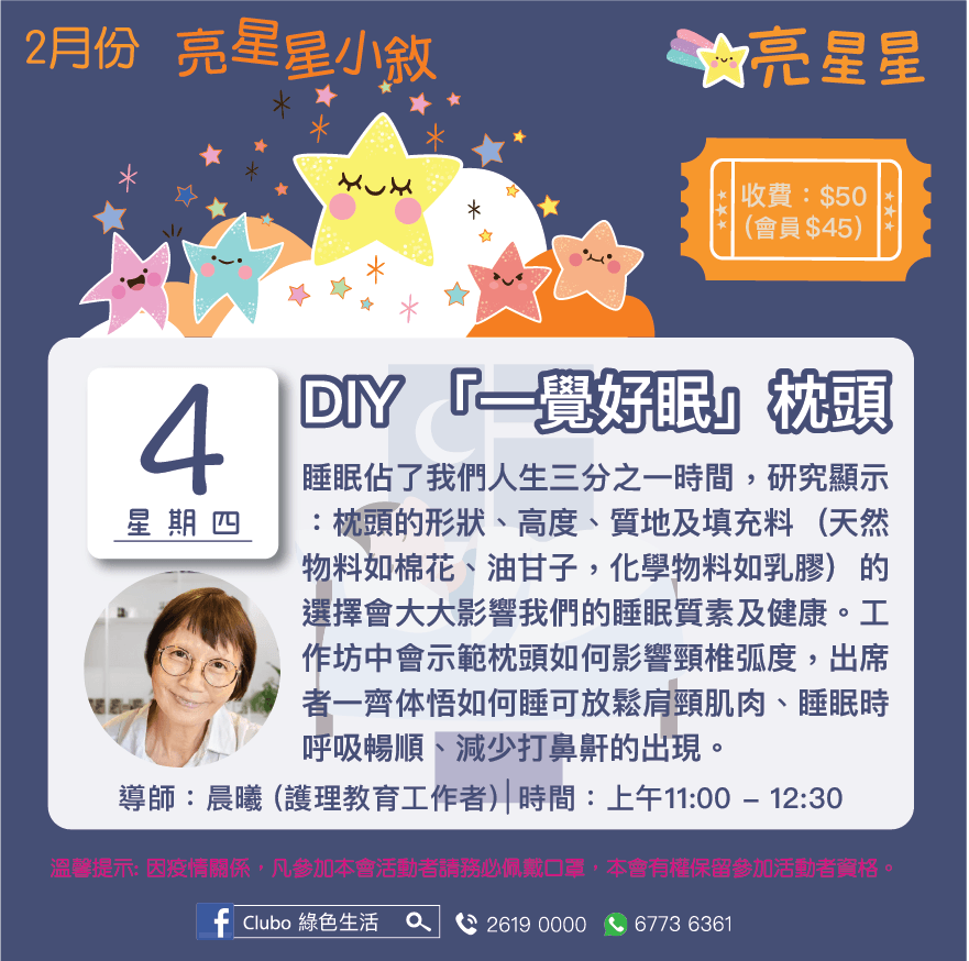 《DIY 「一覺好眠」枕頭》(已額滿,謝謝各位支持) 主講:晨曦 (護理教育工作者) 日期:2月4日 (週四) 時間:上午11:00 - 12:30 收費:$50 (會員 $45) 睡眠佔了我們人生三分之一時間,研究顯示:枕頭的形狀、高度、質地及填充料 (天然物料如棉花、油甘子,化學物料如乳膠) 的選擇會大大影響我們的睡眠質素及健康。工作坊中會示範枕頭如何影響頸椎弧度,出席者一齊体悟如何睡可放鬆肩頸肌肉、睡眠時呼吸暢順、減少打鼻鼾的出現。 晨曦會和大家分享如何選擇枕頭, 不同填充物 ,她會介如何自家製作枕袋及選擇填充料,一齊做一個不論平睡或側睡都讓自己頭頸肩肌肉都可以放鬆的「一覺好眠」枕頭。 導師介绍 : 晨曦(Agnes),護理教育工作者,曾在公開大學任教「健康促進」課程多年。在Club O策劃亮星星小敘工作坊,以不同的角度探索幸福綠色健康生活,讓自己生命如天上小星星般發光發熱。 ------------------------------------------------------------------- 馬上申請成為Club