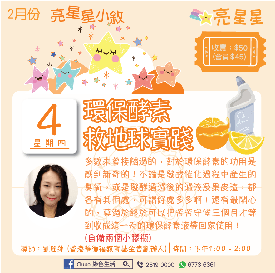 《環保酵素救地球實踐》(此班為巳繳費同學) 主講:劉麗萍(Daphine) 日期:2月4日 (週四) 時間:下午1:00 - 2:00 收費:$50 (會員 $45) 多數未曾接觸過的,對於環保酵素的功用是感到新奇的!不論是發酵催化過程中產生的臭氧,或是發酵過濾後的濾液及果皮渣,都各有其用處,可謂好處多多啊!還有最開心的,莫過於終於可以把苦苦守候三個月才等到收成這一天的環保酵素液帶回家使用! (請自備兩個小膠瓶啊) ------------------------------------------------------------------- 報名表:https://forms.gle/JHvSk7MEXYLtVtUb8 ------------------------------------------------------------------- 馬上申請成為Club O會員, 享有會員優惠: https://forms.gle/p5tfx2Cjir9Uy5EU8 * * * * *
