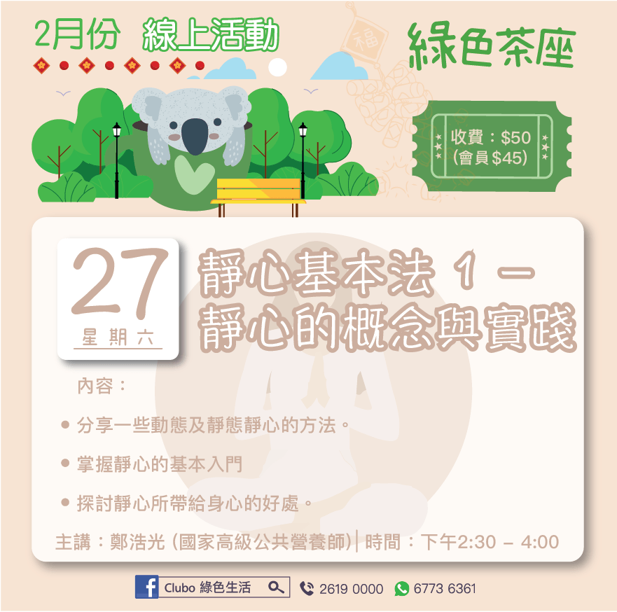《靜心基本法 1 – 靜心的概念與實踐》 主講:鄭浩光 (國家高級公共營養師) 日期:1月23日 (週六) 時間:下午2:30 - 4:00 收費:$50 (會員 $45) 線上課堂 靜心是甚麼?為甚麼需要靜心?靜心的意義為何?靜心會走火入魔嗎?靜心與靜坐有何不同?靜心是否一定要盤蹆?練習靜心的時間是否越長越好?如何透過靜心改善身體及心理健康?如何把靜心運用於日常生活中? 此工作坊會與大家探討以上問題,並分享一些動態及靜態靜心的方法。讓參加者可掌握靜心的基本入門,多加練習,漸漸感受靜心所帶給身心的好處。 ------------------------------------------------------------------- 報名表:https://forms.gle/JHvSk7MEXYLtVtUb8 ------------------------------------------------------------------- 馬上申請成為Club O會員, 享有會員優惠: https://forms.gle/p5tfx2Cjir9Uy5EU8