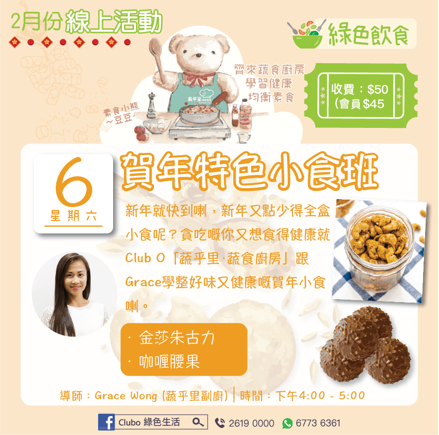 Club O 旺角亞皆老街86號昌明大厦7字樓FGH室《賀年特色小食》 主講:Grace Wong (蔬乎里副廚) 日期:2月6日 (週六) 時間:下午4:00 - 5:00 收費:$50 (會員 $45) 線上課堂 新年就快到喇,新年又點少得全盒小食呢?貪吃嘅你又想食得健康就Club O「蔬乎里·蔬食廚房」跟Grace學整好味又健康嘅賀年小食喇。 內容: · 金莎朱古力 · 咖喱腰果 ------------------------------------------------------------------- 報名表:https://forms.gle/JHvSk7MEXYLtVtUb8 ------------------------------------------------------------------- 馬上申請成為Club