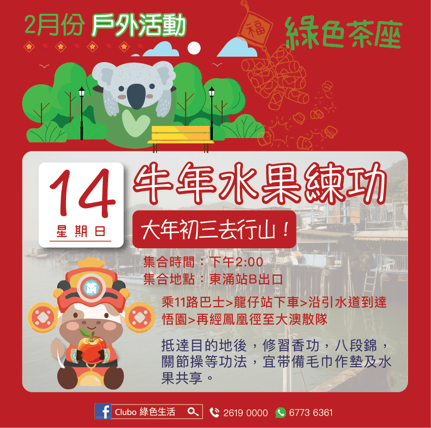 Club O 旺角亞皆老街86號昌明大厦7字樓FGH室正月初三去行山 日期:2月14日(週日) 領隊:歐振宗 集合時間:下午2:00 集合地點:東涌地鐵站B出口廣場 行程: 下午2:00東涌地鐵站B出口廣場集合,乘11路巴士龍仔站下車,沿引水道到達悟園,再經鳳凰徑至大澳散隊。適當地點練功,請带備水果共享。 難度: 1星半,行程約2小時。 毋須報名,於集合時間在集合地點會看見Club O旗仔,敬請準時!