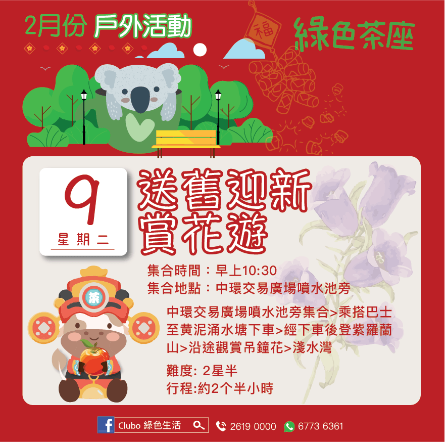 Club O 旺角亞皆老街86號昌明大厦7字樓FGH室日期:2月9日(週二) 領隊:歐振宗 集合時間:早上10:30 集合地點:中環交易廣場噴水池旁 行程: 早上10:30中環交易廣場噴水池旁集合,乘搭巴士至黄泥涌水塘下車,經下車後登紫羅蘭山,沿途觀賞吊鐘花。終點係風景如畫的淺水灣。 難度: 2星半 行程約2个半小時,由山脚到山顶大概二百八十米。 毋須報名,於集合時間在集合地點會看見Club O旗仔,敬請準時!
