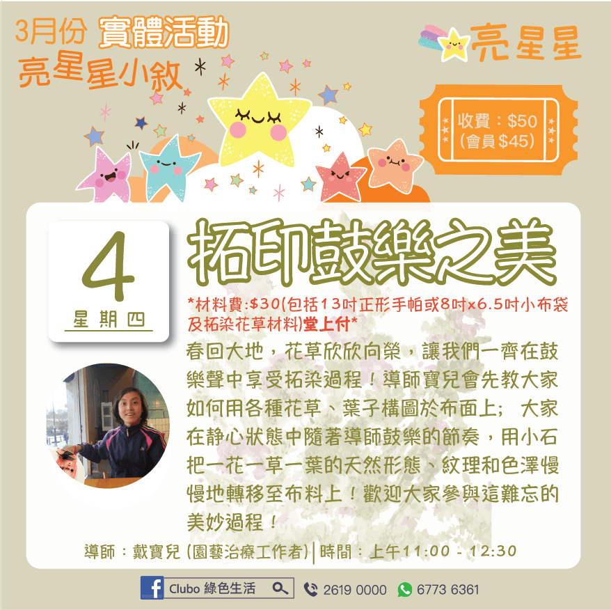 《亮星星小敘 - 拓印鼓樂之美》 導師:戴寶兒 (園藝治療工作者) 日期:3月4日 (週四) 時間:上午11:00 - 12:30 收費:$50 (會員 $45) 材料費:$30(包括13吋正形手帕或8吋x6.5吋小布袋及拓染花草材料)堂上付 實體課程 春回大地,花草欣欣向榮,讓我們一齊在鼓樂聲中享受拓染過程!導師寶兒會先教大家如何用各種花草、葉子構圖於布面上; 大家在静心狀態中隨著導師鼓樂的節奏,用小石把一花一草一葉的天然形態、紋理和色澤慢慢地轉移至布料上!歡迎大家參與這難忘的美妙過程! 導師簡介 戴寶兒,曾於不同的社福機構擔任導師,帶領拓印、陶藝、園藝、非洲鼓、烹飪班等工作坊,為香港園藝治療協會之註冊園藝治療師。 ------------------------------------------------------------------- 報名表:https://forms.gle/9z2zeXP26R2nHAGP7 ------------------------------------------------------------------- 馬上申請成為Club O會員,