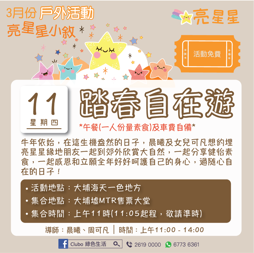 Club O 旺角亞皆老街86號昌明大厦7字樓FGH室《亮星星小敘 - 踏春自在遊》- 戶外活動 主持:晨曦、可凡 日期:3月11日 (週四) 時間:上午11:00 - 14:00 費用:免費,午餐(一人份量素食)及車費自備 集合地點:大埔墟MTR售票大堂 集合時間:上午11:00 (11:05起程,敬請準時。) 活動地點: 大埔海天一色地方 牛年依始,在這生機盎然的日子,晨曦及女兒可凡想約埋亮星星緣地朋友一起到郊外欣賞大自然,一起分享健怡素食,一起感恩和立願全年好好呵護自己的身心,過随心自在的日子! 導師簡介 晨曦,護理教育工作者。在Club O策劃亮星星小敘工作坊,以不同的角度探索幸福綠色生活,和大家一齊尋找令自己及家人健康快樂起來的生活方式。 周可凡 是太極、手療和心像術 (Heart Imagery)