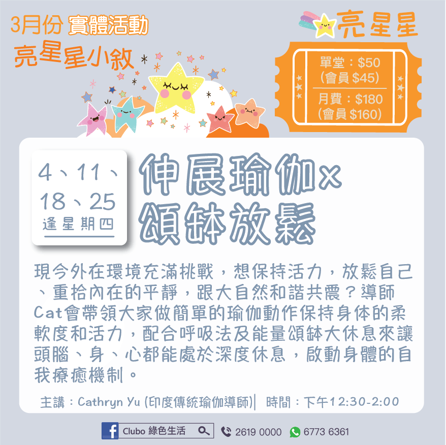 Club O 旺角亞皆老街86號昌明大厦7字樓FGH室《伸展瑜伽x頌缽放鬆》Relaxation stretching with singing bowl - 實體課程 導師:Cathryn Yu (印度傳統瑜伽導師) 日期:3月4、11、18、25日 (週四) 時間:下午12:30 - 2:00 收費:$50 (會員 $45) (三月份抗疫優惠,月費 $180,會員$160) 現今外在環境充滿挑戰,我們要怎樣保持活力,放鬆自己、重拾內在的平靜,放下塵世紛擾,讓身、心、靈合一,跟大自然和諧共震,得到內在的平安?導師Cat會帶領大家做簡單的瑜伽動作保持身体的柔軟度和活力,配合呼吸法及能量頌缽大休息來讓頭腦、身、心都能處於深度休息,啟動身體的自我療癒機制。 導師簡介 導師簡介: Cathryn