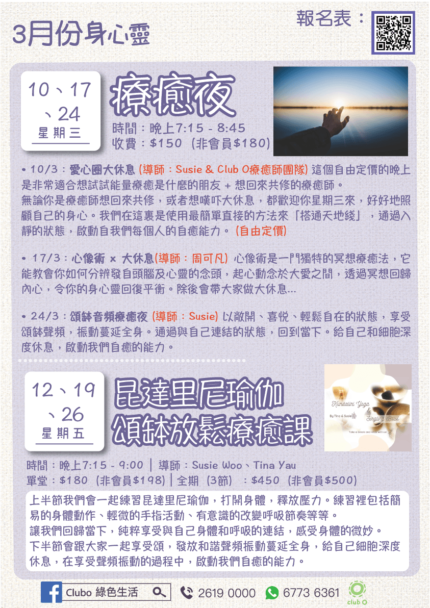 Club O 旺角亞皆老街86號昌明大厦7字樓FGH室【療癒夜】 逢星期三 7:15 - 8:45pm 🌈2021年3月10日 導師:Susie & Club O療癒師團隊 愛心圈大休息(自由定價) 這個自由定價的晚上是非常適合想試試能量療癒是什麼的朋友 + 想回來共修的療癒師。 無論你是療癒師想回來共修,或者想嘆吓大休息,都歡迎你星期三來,好好地照顧自己的身心。我們在這裏是使用最簡單直接的方法來「搭通天地綫」,通過入靜的狀態,啟動自我們每個人的自癒能力。 🌈2021年3月17日 導師:周可凡 心像術 x 大休息 心像術是一門獨特的冥想療癒法,它能教會你如何分辨發自頭腦及心靈的念頭,起心動念於大愛之間,透過冥想回歸內心,令你的身心靈回復平衡。除後會帶大家做大休息...
