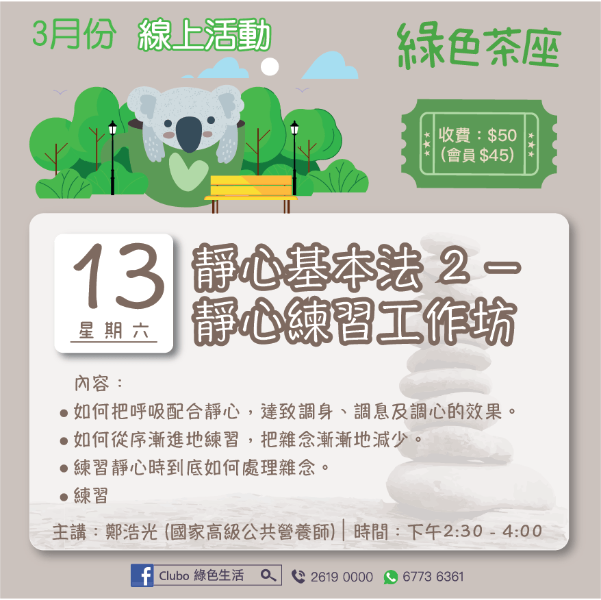 《靜心基本法 3 – 靜心生活化工作坊》 主講:鄭浩光 (國家高級公共營養師) 日期:3月27日 (週六) 時間:下午2:30 - 4:00 收費:$50 (會員 $45) 線上課堂 靜心不單只是打坐而已,一定要配合正當的觀念,並應用於日常生活中,讓我們可以放開對好、壞、對、錯事情的執著,使我們可以生活得安心愉悅一點。否則,靜心只是練身體、練氣功,執重於外形與外相,留於「空心靜坐」的階段,並不能夠改變我們的心態和人生觀。 此工作坊分享如何透過放鬆身心及體驗呼吸,一步一步把靜心帶到日常生活裡去,讓我們可以身心平和地生活。 ------------------------------------------------------------------- 報名表:https://forms.gle/9z2zeXP26R2nHAGP7 ------------------------------------------------------------------- 線上活動:在開始之前參加者可以先安裝Club O 的「綠色生活 App」,
